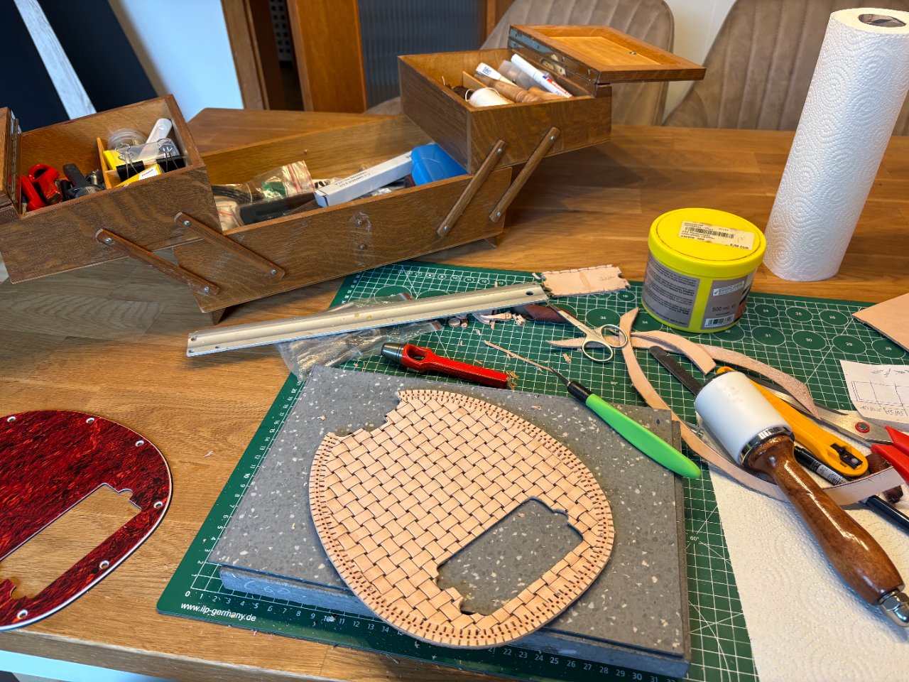Also fix eine Idee in Angriff genommen, die mich schon länger umgetrieben hat: Ein Pickguard aus Leder.