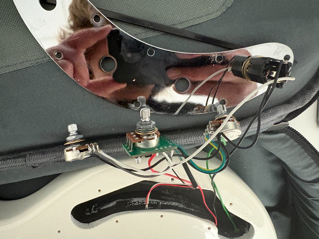 Während das Fretboard in Maple und der Body in Olympic White genau meinen Geschmack treffen, war das Tort Pickguard gelinde gesagt: Koblenz! (Also nicht Mainz.)