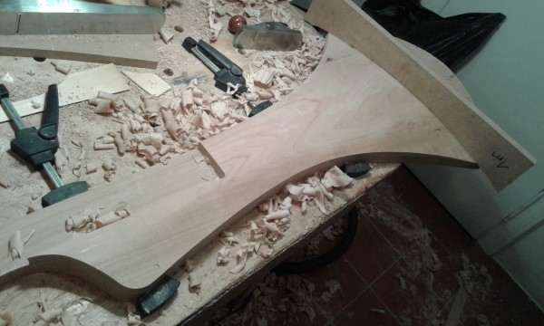 Zuerst den Korpus auf dicke gebracht, dann wurde die Kontur gefäst. Danach die Halstasche. Die Leimfläche ist recht groß, es soll ja auch was halten.