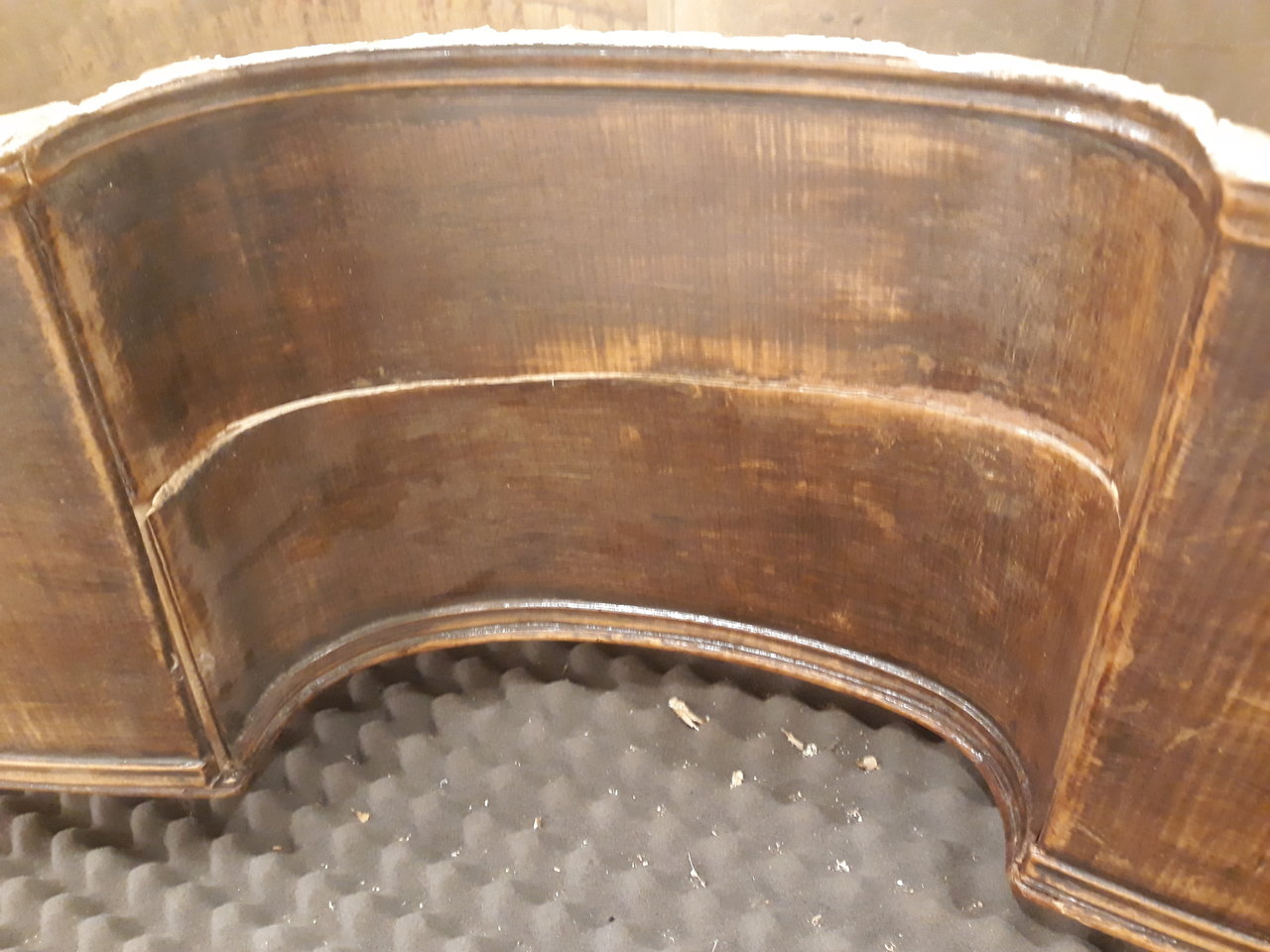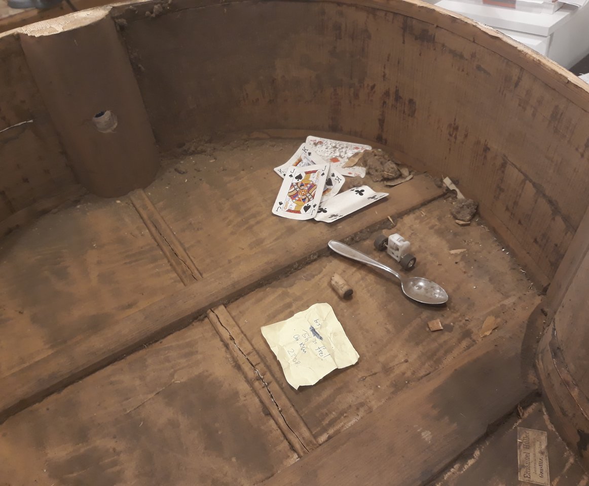 Schöner alter Sächsischer Bass. Mit vielen Rissen, kaputtem Halsklotz und Bodenplättchen. Und was man alles so darin findet....