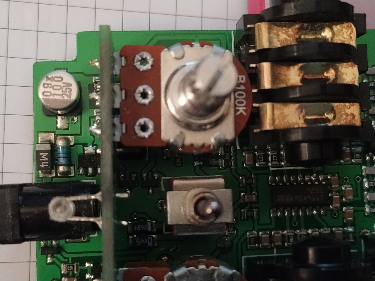 Das Bauteil neben der Strombuchse sieht verschmiert aus.