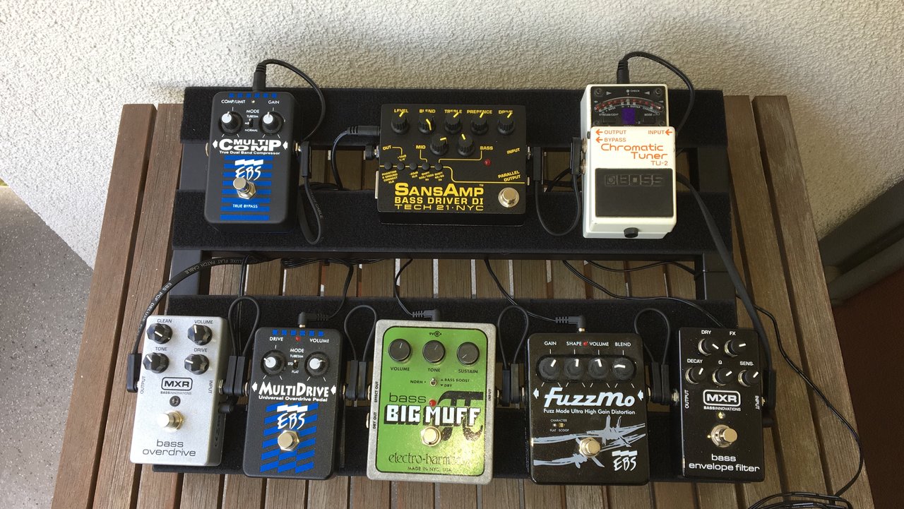 Du könntest auch zu SansAmp und Tuner 'ne 3er-Steckerleiste auf's Board kletten für die zwei Netzteile und den Empfänger beim Gig lose drauf oder daneben legen, dann bräuchtest Du kein größeres Rack und nur ein Kabel vom Board zum Amp, was halt schon nen Unterschied macht wenn's 10 m sind. Fraglich ist halt, ob das dann brummt und wie sich das mit Eurem Bühnengebaren (Hüpfen, Bier) verträgt. Kommt das Brett nach vorne oder vor/auf den Amp?
