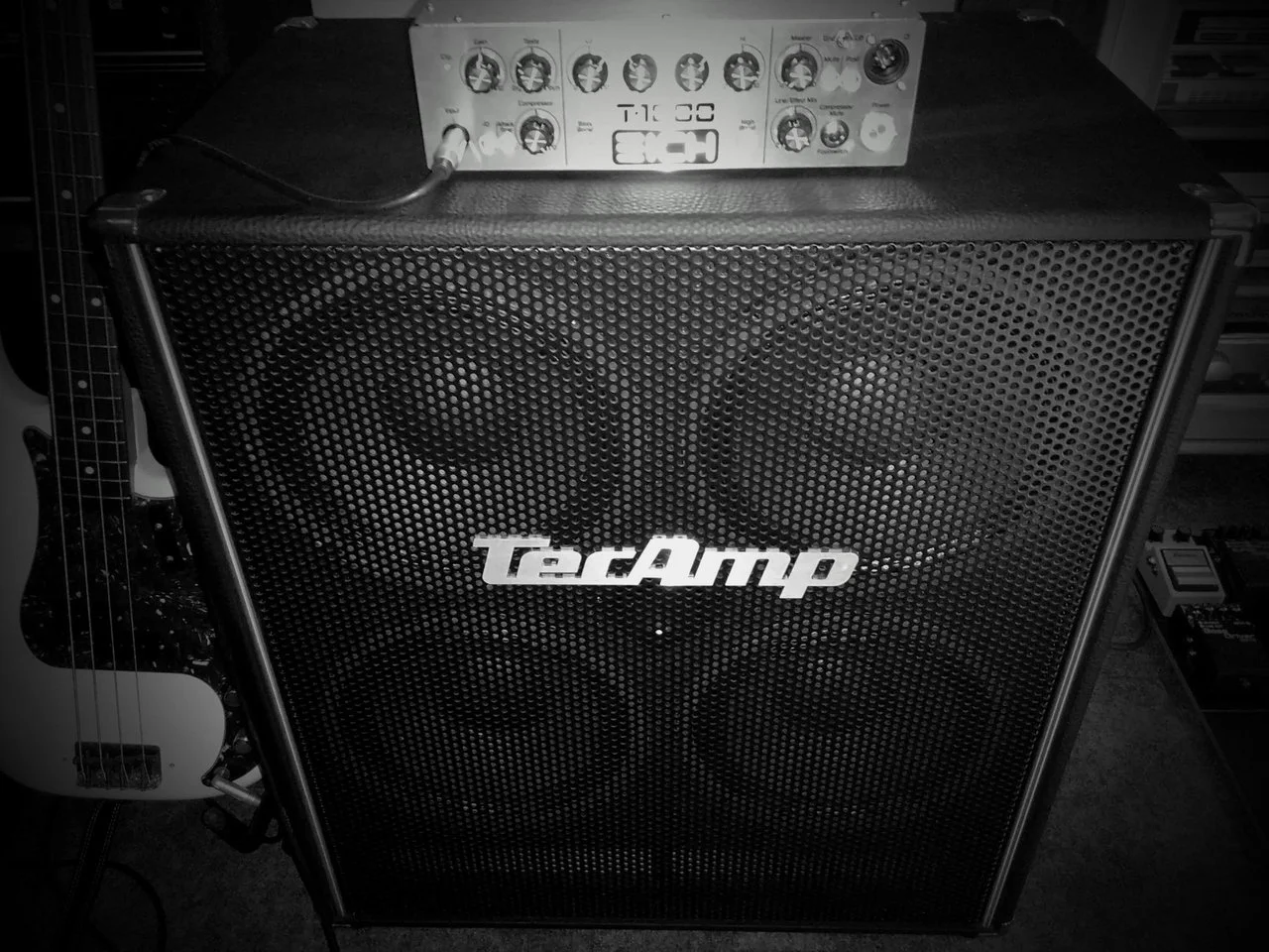 Ampeg SVT200Ts ersetzen könnten. Ziel ist natürlich eine Transporterleichterung. In einem lokalen Musikfachgeschäft fand ich in einem lauschigen Eckchen doch tatsächlich zwei (betagte aber nagelneue) einsame TecAmp-Cabinets, eine 212M und eine 410L, umringt von