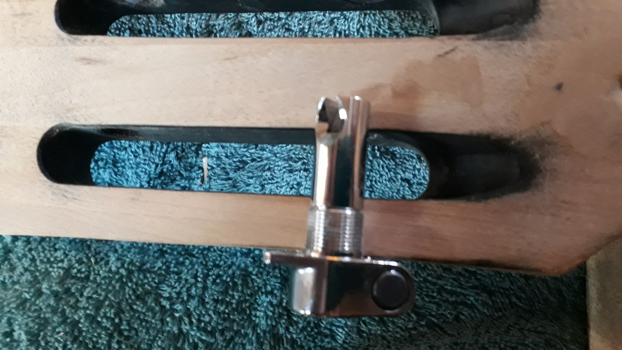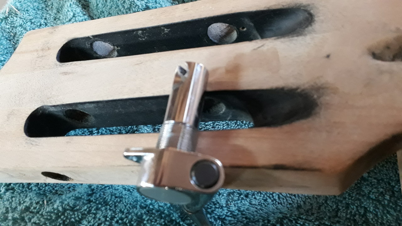 Hast Du noch genug Fleisch in den Flanken des headstock übrig? Der Durchmesser der Dinger scheint bisschen groß zu sein für die schlanken Flanken des headstock? Bei anderen Instrumenten mit diesem Headstock sind die Wellen der Mechaniken viel dünner… Da ist ganz schön Last drauf. Unten Leisten aufkleben?Tja, warum einfach, wenn es auch kompliziert geht. Die Mechaniken sind prima, scheinen sehr wertig und ich verbau die. Aber die Aufnahme für die Saiten auf der Welle liegen zu knapp mittig, so dass ich neue Löcher bohren muss. Und wie das dann so ist, muss ich erstmal richtig gute kleine Bohrer kaufen, damit ich die Löcher anständig mit der Standbohrmaschine bohren kann. Ich kann die dann auch so bohren, dass die Saiten angemessen versetzt aufgezogen werden können, so das dann bässer mit dem Sattel harmoniert. Die jetzigen Aufnahmen für die Saiten werde ich irgendwie - z.B. mit Metallpaste oder so - verschließen, oder auch nicht.