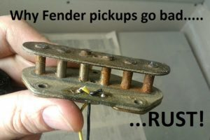 Das ging auch ein paar Jahre gut, doch von einem Schlag auf den anderen war der obere Pickup plötzlich deutlich leiser als der untere. Ich hab die Erdung (Kuferfolie unterm Pickup) entfernt und alles ist wieder wie’s sein soll. Nur dass es wieder fritzelt, wenn man den Magneten berührt. Sobald ich Masse auf den Magneten lege, wird’s wieder leiser.