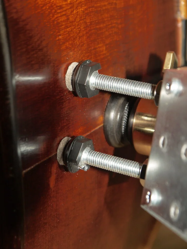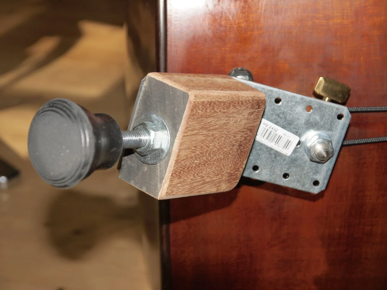 so in etwa, aber als vierkant in der stachelbirne, das gewicht des basses dreht den stachel sonst ständig gegen die schraube, das hält nicht. sieht auf jeden fall elegant aus, nicht so grob wie mein hilfskonstrukt. denkbar wäre auch ein saitenhalterknopf weiter vorne am unterbug und ein stachel, dessen birne schräg eingelassen wird.
