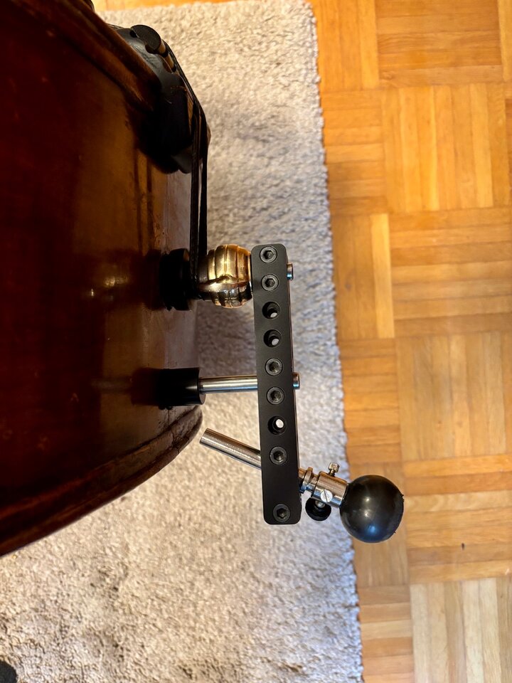In der Position mit Kombination aus Rob und Ergobass schwingt der Bass sehr frei aus, ich höre einen deutlichen Zuwachs an Lautstärke und merke auch mehr Resonanz beim Spielen. Der Bogenwinkel funktioniert auch viel leichter, es geht mehr Richtung Cello, sehr spannend. In der deutschen Haltung muss ich einiges an Gewicht aus dem Arm nehmen da er nun von oben sehr direkt auf der Saite liegt und diese schnell mal abquetschen kann, besonders am Frosch. Für die französische Haltung ist es einfach nur perfekt, der Bogen fällt ganz natürlich auf die Saite und ermöglicht den kompletten Bewegungsradius. Nun wundert mich nicht das es bei vielen Cellisten so mühelos aussieht… Aber auch der deutsche Bogen gewinnt enorm, gerade wenn dieser nicht zu schwer ist. Für die rechte Hand also schon mal eine echte Verbesserung!