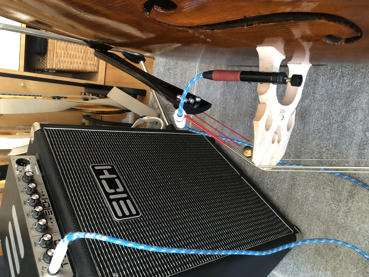 Am Eich t 900 - Verstärker und dem Eich 210 xs-8 Monitor benötige ich am Poti des Pickups etwa eine Vierteldrehung, ebenso am Gain des Verstärkers, den Rest regele ich über die Lautstärke des Verstärkers.