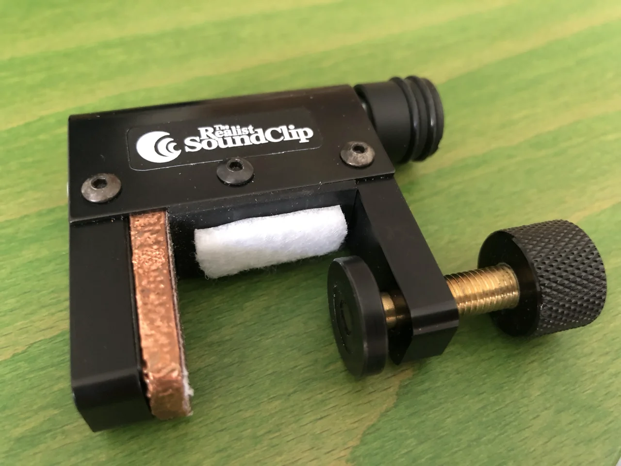Ich versuche daher heute, die seitliche Flanke der Klemme, die ich gegen den Steg drücke, mit einem Filz zu belegen, um die Zwängung zu reduzieren. Ich hoffe so, einen festen Sitz zu erreichen, ohne die Beweglichkeit des Steges einzuschränken. Daher hänge ich auch keine Gewichte dran und befestige das Kabel am Saitenhalter zur Gewichtsentlastung.