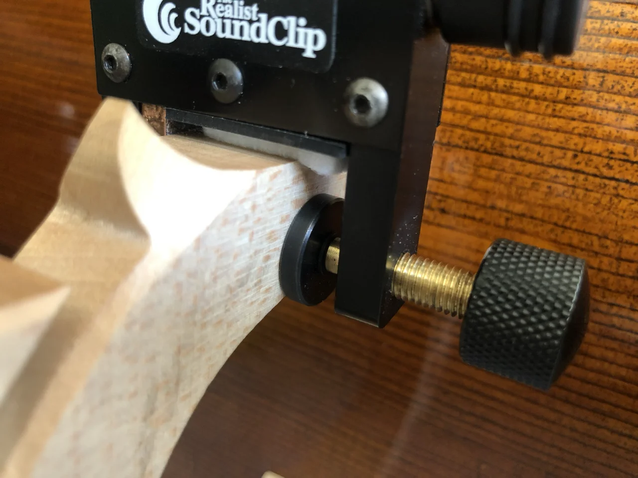 Daher habe ich die seitliche Flanke gegen den Steg gedrückt und die untere Seite, wo der Tonabnehmer sitzt, so vollflächig und parallel wie möglich an den Steg gepresst. Danach habe ich die Klemme satt angezogen.