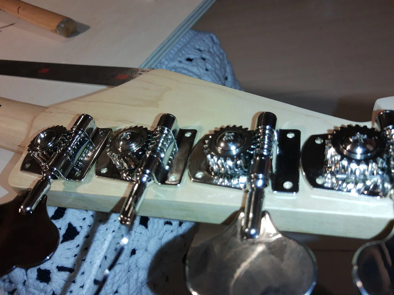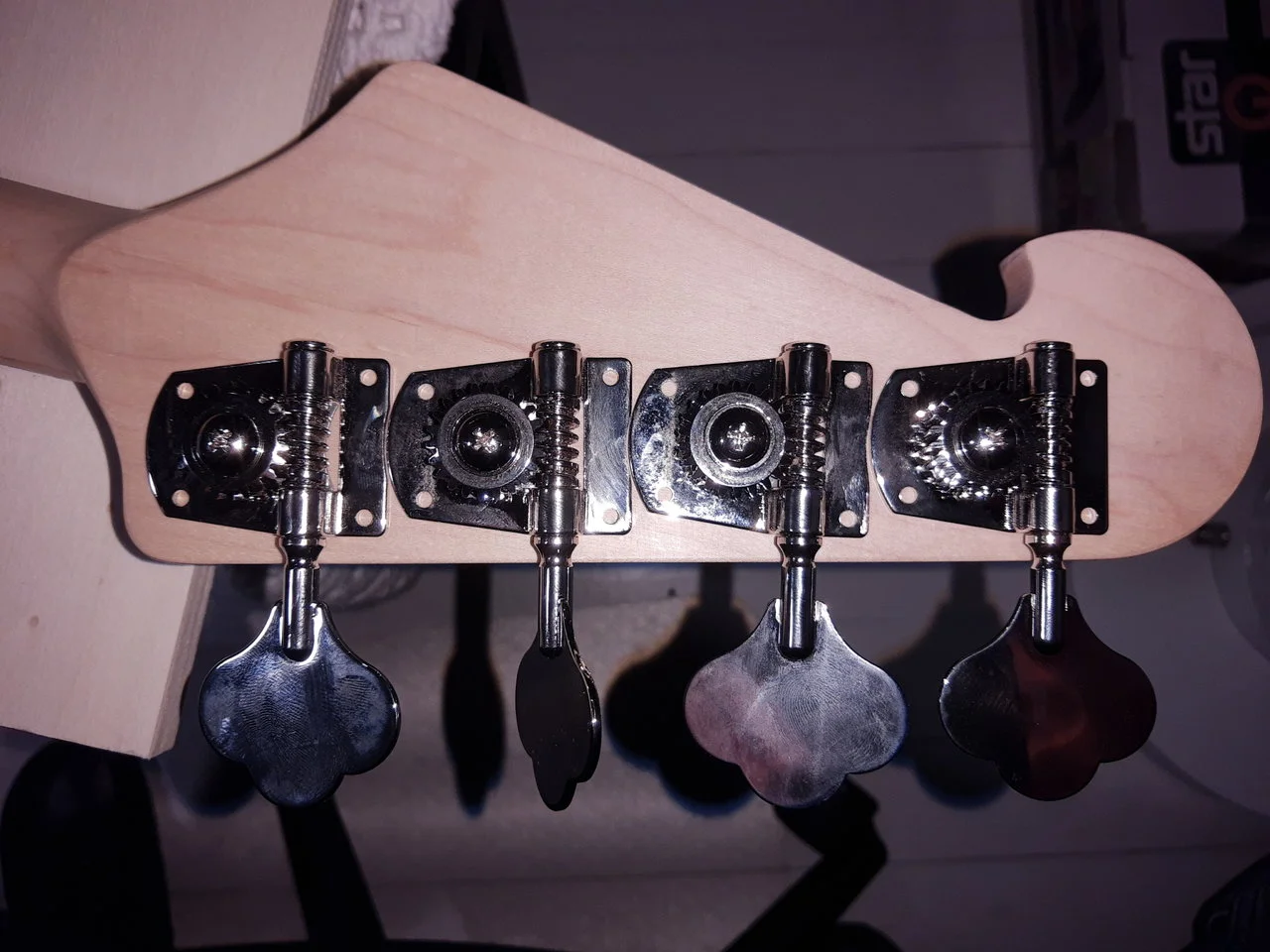 wie andere schon vor mir, möchte ich mir einen JB selber schnitzen. Heute kam das Paket vom T mit Tunern und einer Brücke. Ich versuche die Kosten klein zu halten und entscheide mich meist für gutes P/L Verhältnis. Es ist ein Versuch, mit den Mitteln, die mir zur Verfügung stehen, erst einmal einen Standard-Korpus zu erstellen. Einen Hals traue ich mich noch nicht. Wenn dieses Projekt zu meiner Zufriedenheit beiträgt, werde ich aber auch das nochmal verfolgen. Derzeit tut es erst einmal ein günstiger Hals von Dr. Parts.