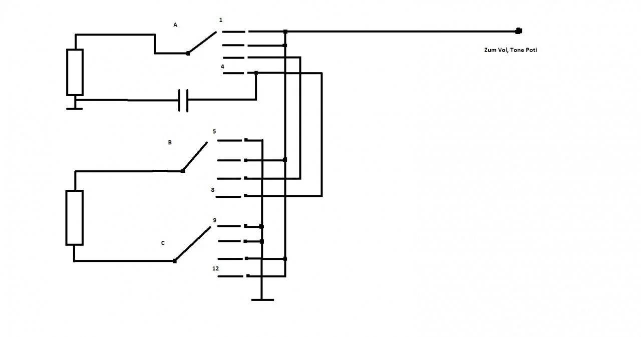 Ich habe versucht, alles anhand der Bilder zu rekonstruieren. Jetzt hängt nur noch die Strippe vom Neck-PU rum. Da er aber alleine nicht schaltbar ist, sondern nur mit dem Steg bin ich total überfordert, weil ich auch die Schaltung vom Dreh-Schalter nicht habe/kenne. Und dann soll der Steg ja auf 3 mit "herabgesetzter Resonanzfrequenz..." tönen...