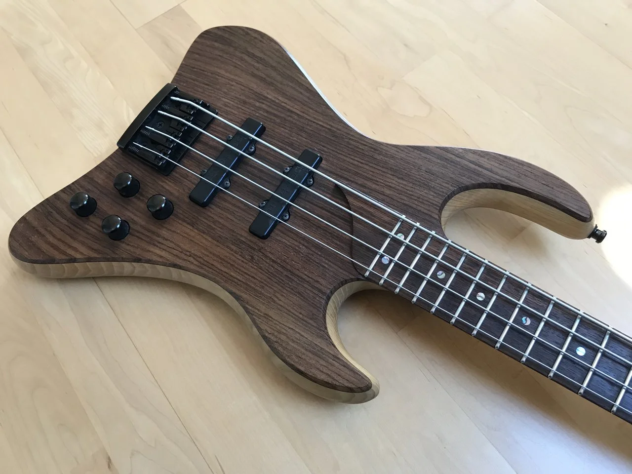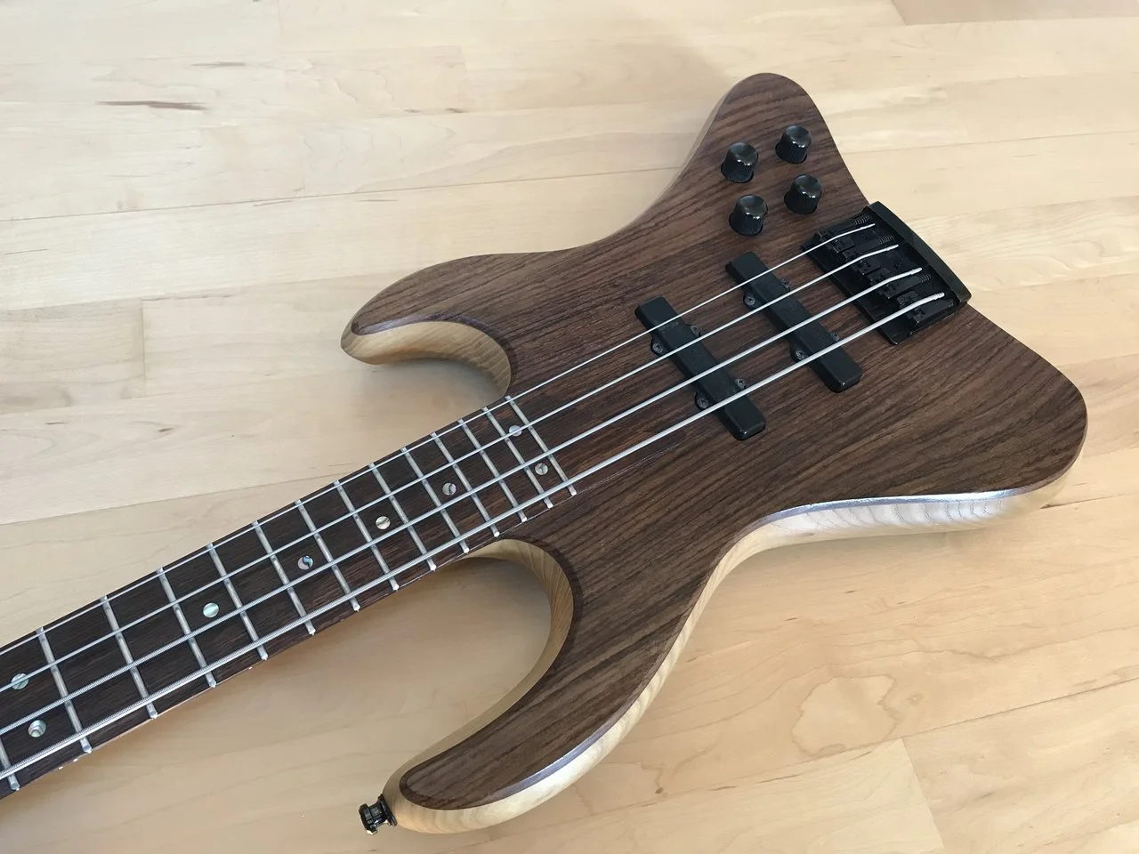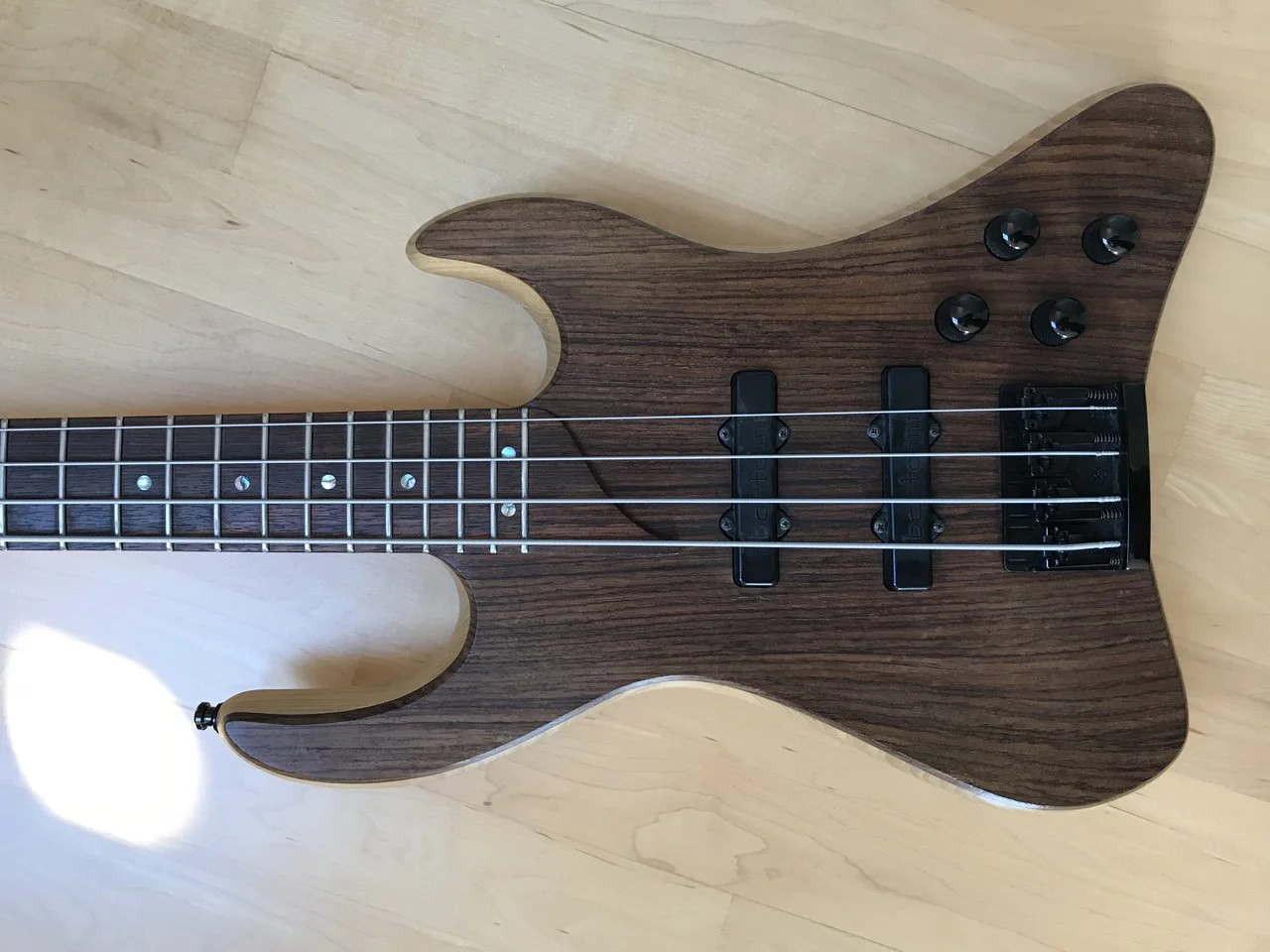 Aktueller Neuzugang in meiner wachsenden Esh-Sovereign-Familie ist ein viersaitiger Fretless aus den 90ern in Dunkel-Aubergine mit silberner Hardware, einem Griffbrett mit hellen Bundmarkierungen und Perlmutt-Punkten an der Halskante. Diesen Bass spiele ich mit dünnen und glatten Flatwound-Saiten. Er hat das Haus noch nicht verlassen.