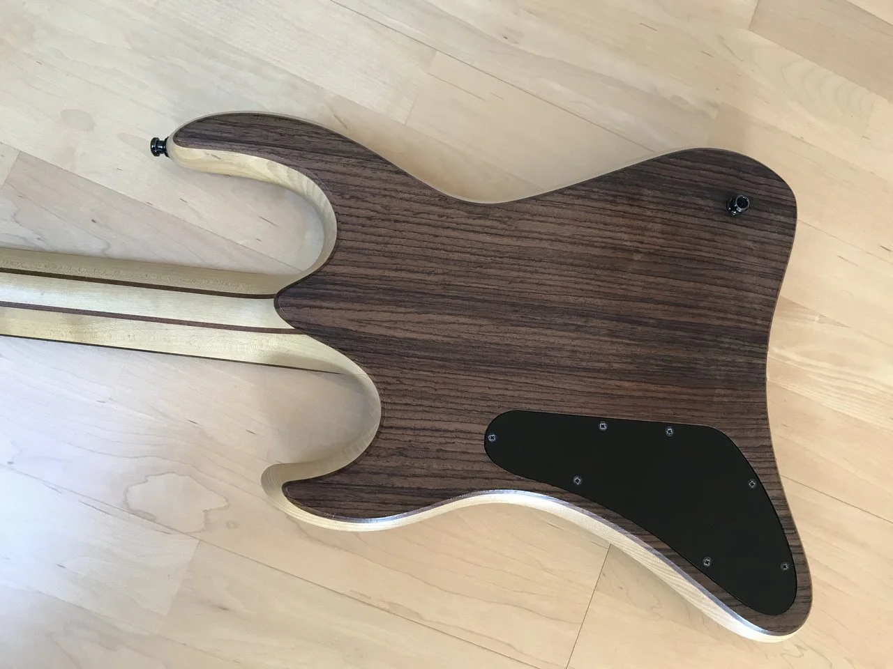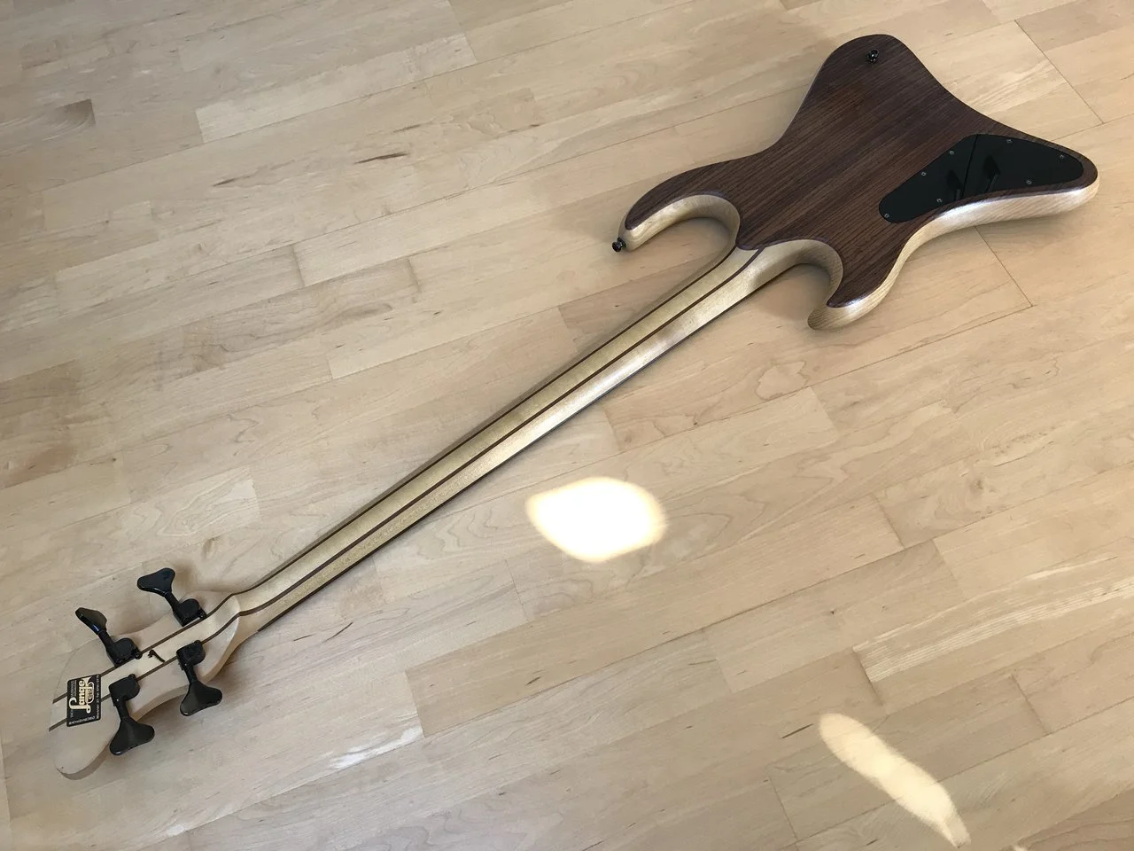 „Du musst ihn anfassen und spielen“: Die erste Berührung mit dem Instrument - ein magischer Augenblick. Durch seine Rundungen an dem markanten, schrägen Korpus, dem besonderen Hals mit Verdickung an der Kopfplatte mit dem nach oben ragenden Horn, der Vogelaugen-Ahorn-Zierde am Kopf und der Aubergine-Lackierung, durch die Eschenholz-Maserung schimmerte, fühlte sich ganz und gar organisch an, als hätte die Natur selbst dieses Instrument hervorgebracht.