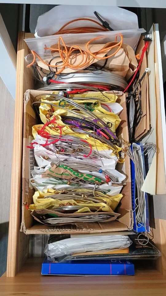 Ich habe für jedes Instrument einen Ersatz -Satz. Bei den Bässen sind die abgelängt und eingespielt.Was macht ihr mit euren alten Saiten ? Sie so einfach wegzuschmeissen habe ich irgendwie Hemmungen, aber nochmal wieder aufziehen tue ich ja dann auch nicht. Ich habe bestimmt noch ein dutzend alte Sätze, meist 5-Saiter.