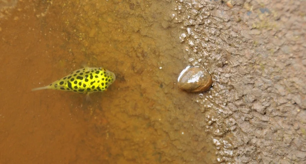 Tetraodon fluviatilis.Kleiner Kugelfisch hätte gerne Schnecke, Schnecke "flüchtet"
