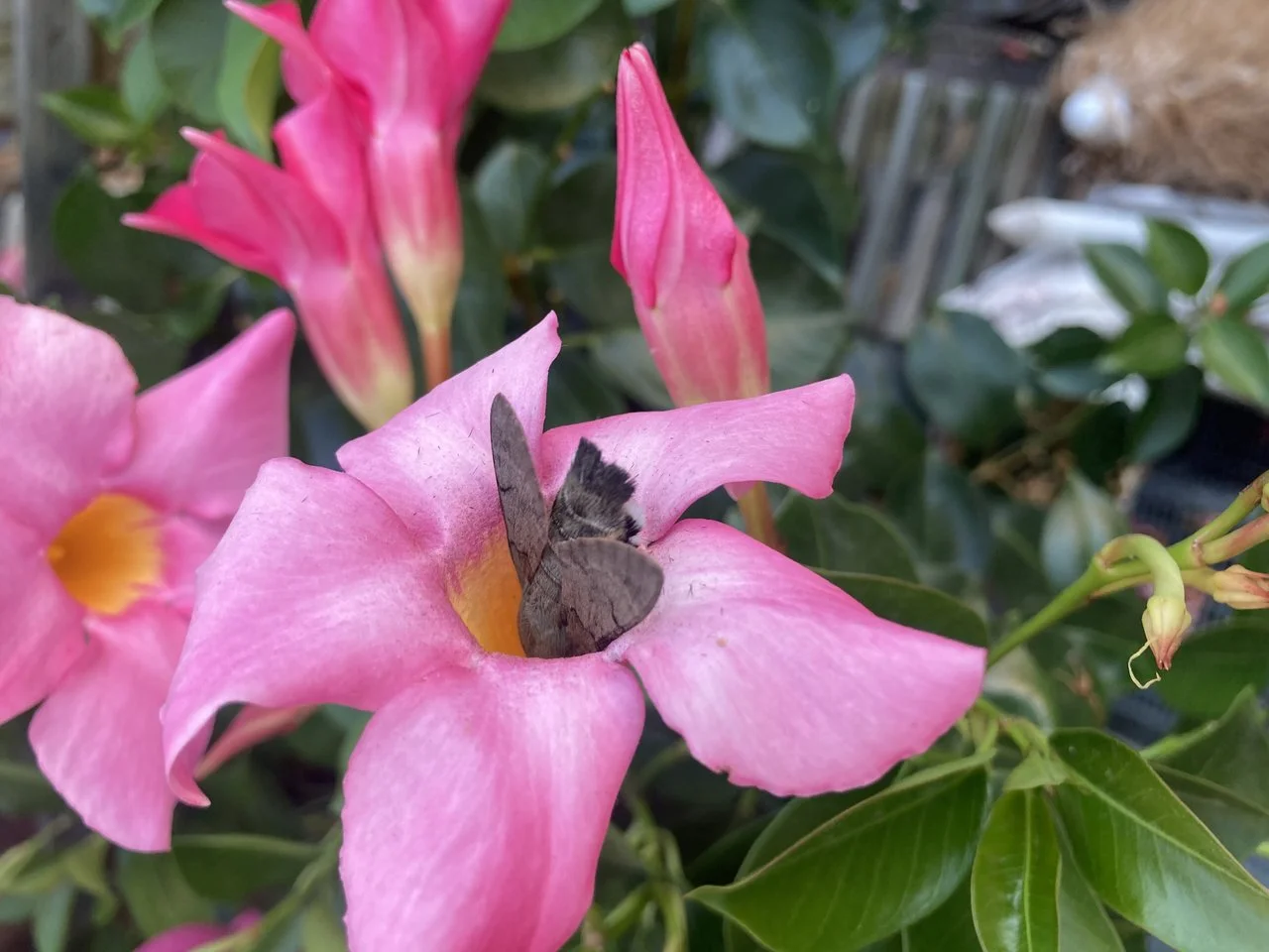 hab heute herausgefunden wie das passiert. Die Dipladenia hakt sich an den Saugrüsseln der Insekten fest.Heute genauso auf unserer Terasse gefunden