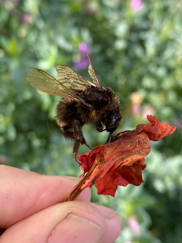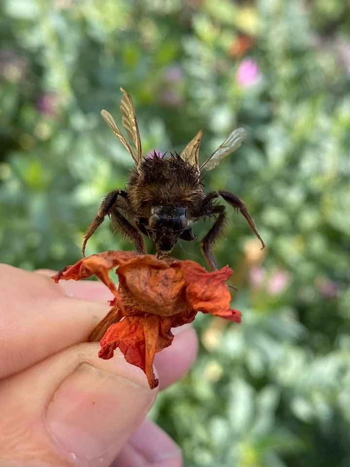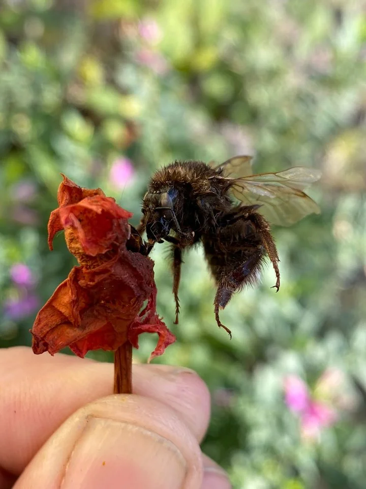 Getrocknete Hummel mit Rüssel in getrockneter Blüte.
