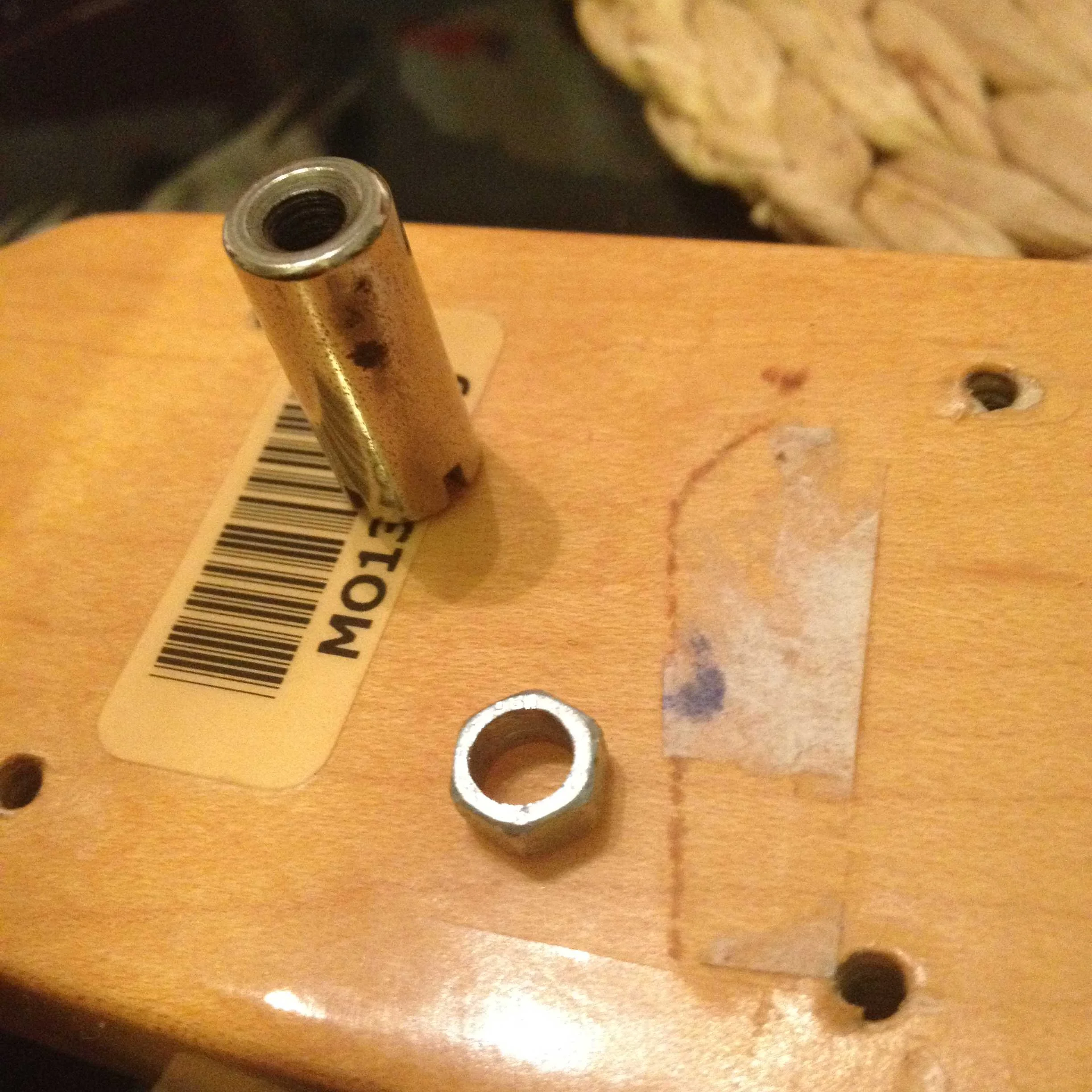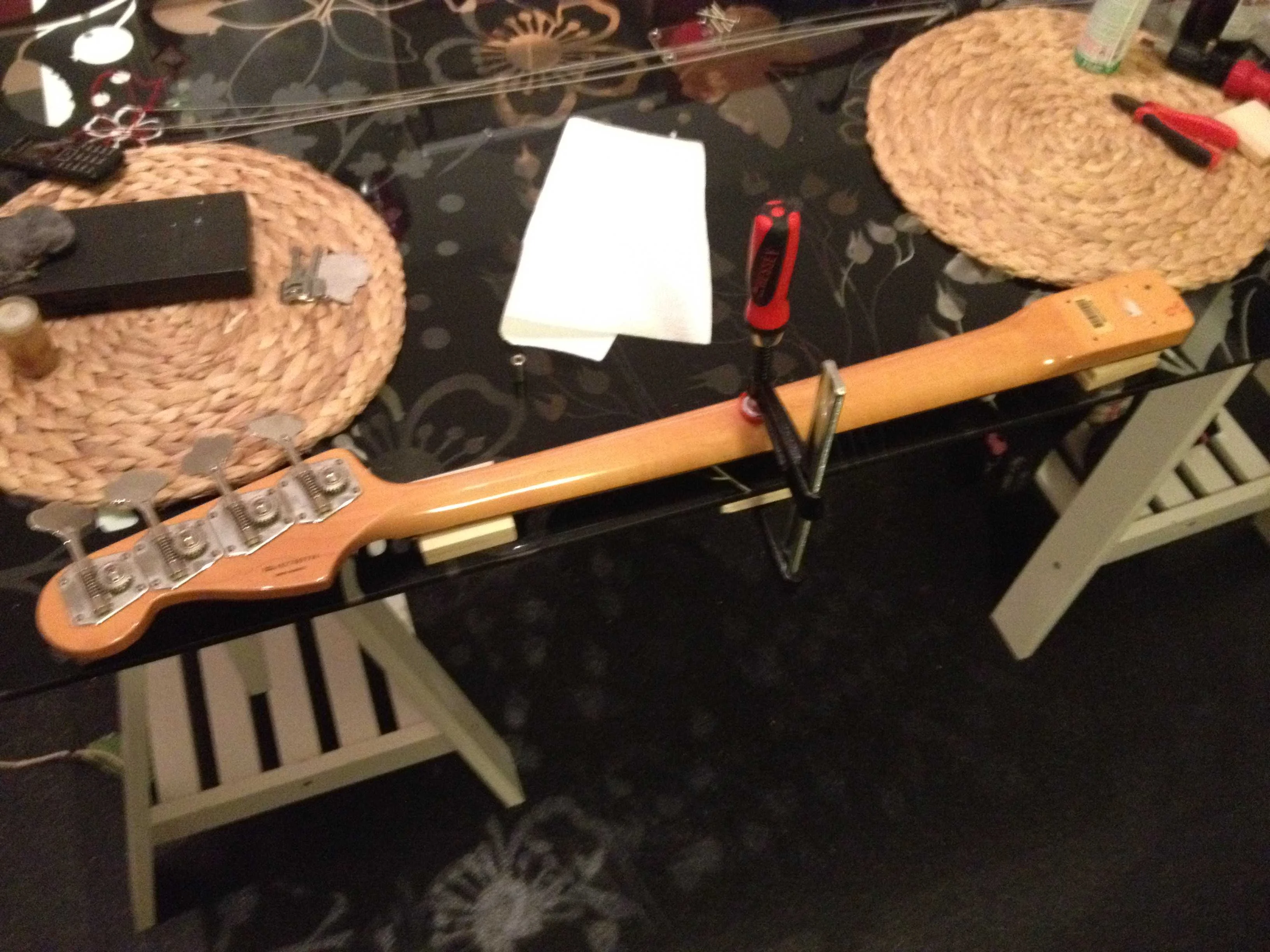Die ersten Tage habe ich dann damit verbracht den Trussrod immer wieder ein Stück nachzujustieren. D.h. Hals abgeschraubt, Mutter etwa eine viertel Umdrehung rechtsrum angezogen, Hals angeschraubt, gestimmt, und das ganze dann am jeweils nächsten Morgen/Abend wieder von vorne... Insgesamt habe ich die Mutter um etwa 3 Umdrehungen (!) angezogen (über mehrere Tage hinweg). Das ist schon enorm viel, oder?