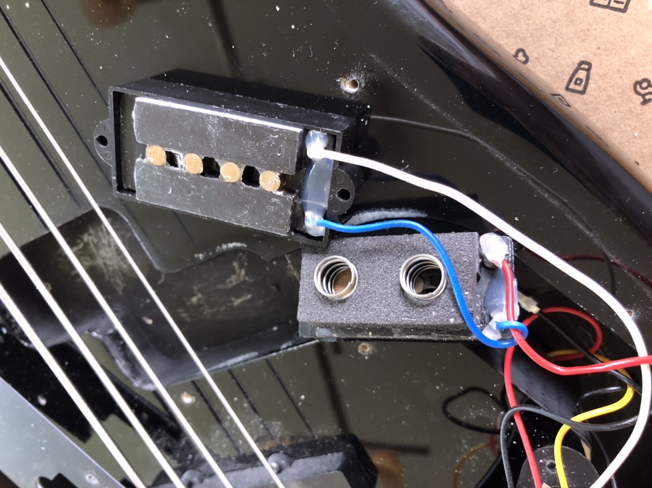 Zusammengefasst war es eigentlich einfach, die alten Pickups rausschrauben, Heißkleber entfernen und ablöten, die Ersatzpickups anlöten, etwas Heißkleber drauf damit alles hebt und wieder mit den vorhandenen Moosgummi und Federn einschrauben. Die neuen waren nur etwas dünner, so dass noch eine kleine Erhöhung drunter kam.