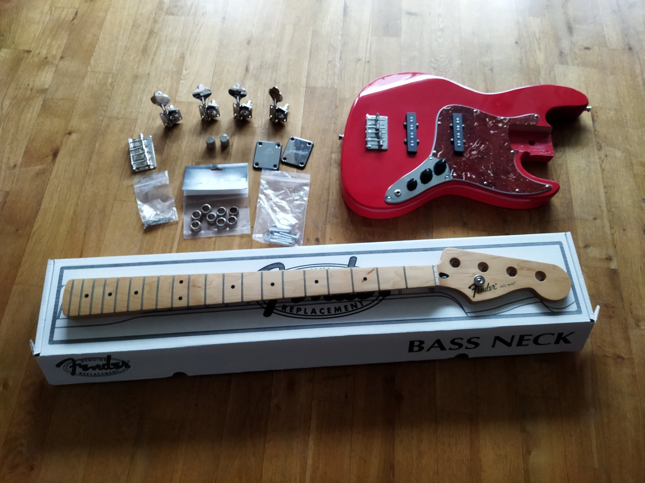 Sahnestück ist sicherlich der originale Fender Jazz Bass Hals aus Mexico-Fertigung. Ist praktisch neu und wurde noch nicht verbaut, Hals-Schrauben waren noch nie ganz drin, es gibt allerdings 4...