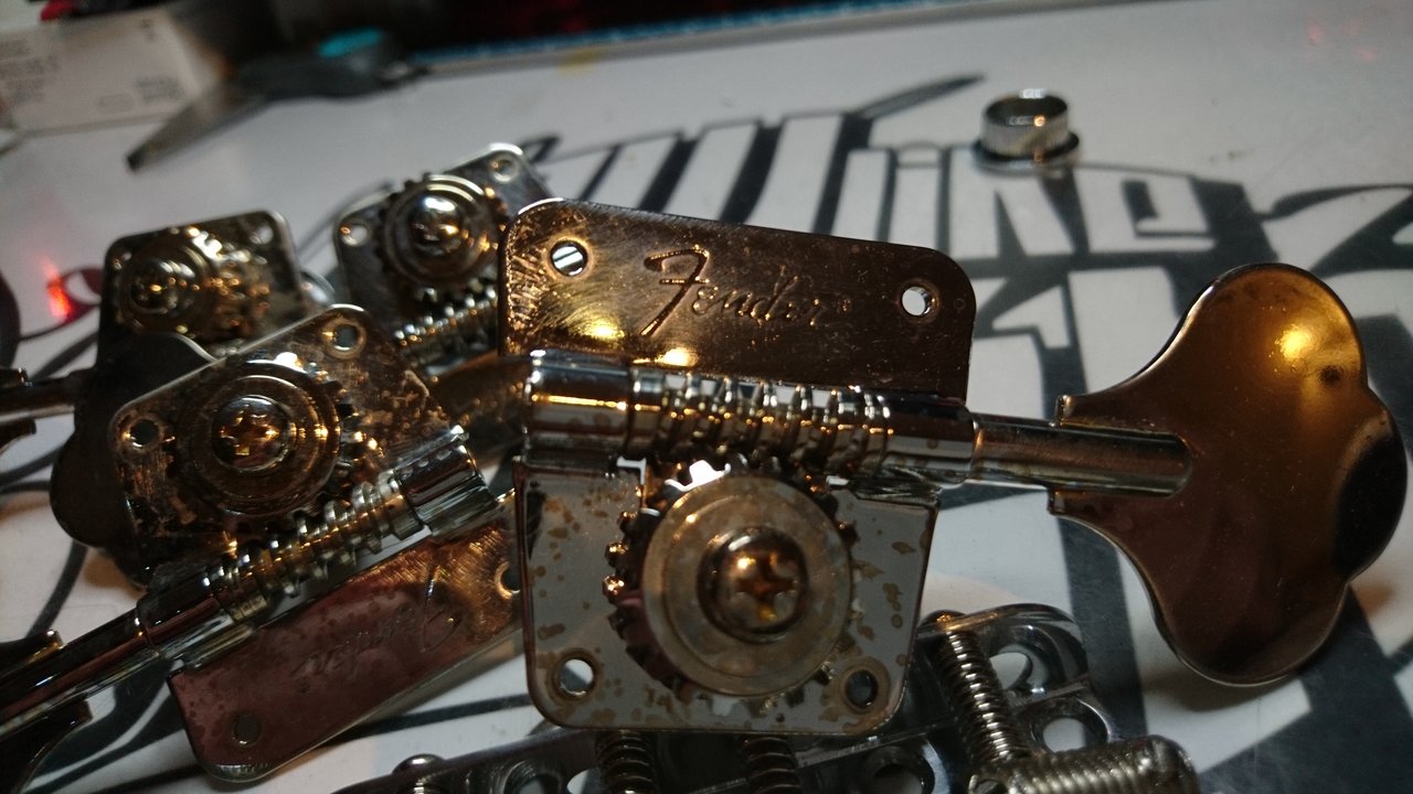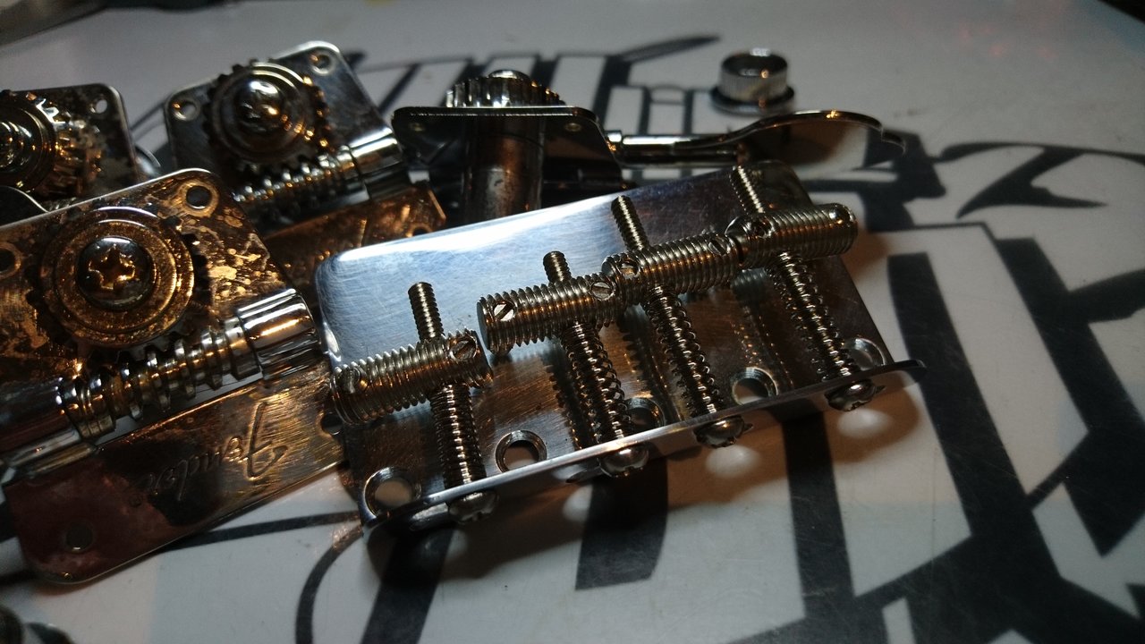 Fender Tuner relic aus den 80ern von einem S Serial JazzBass und dazu eine Fender Rillenreiter Bridge.