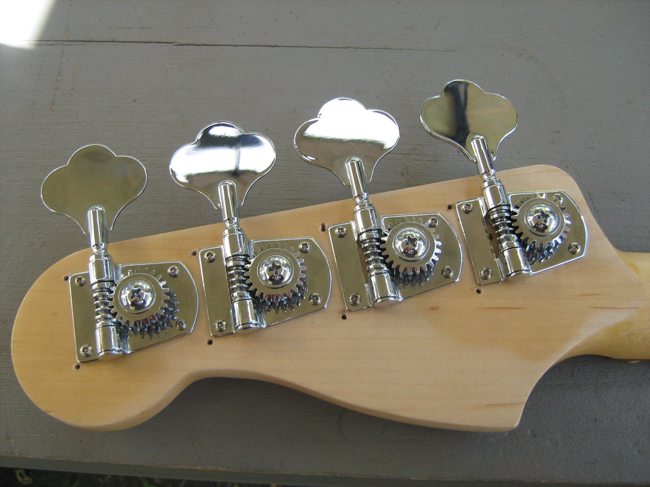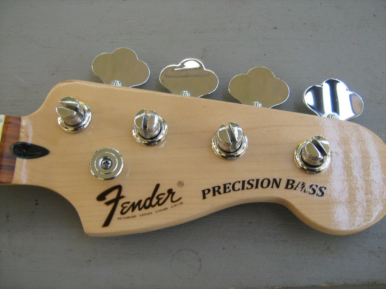ich miste aus und habe hier noch eine Fender Mexico P-Bass Neck mit Pau Ferro Griffbrett, Rockinger Tunern und 70s Decal. Auf der Rückseite der Kopfplatte sind noch Bohrungen für Schaller BMFL o.ä. vorhanden. Unter dem Saitenniederhalter befinden sich noch 2 kleine Löcher, die aber durch den montierten Niederhalter verdeckt sind. Der Hals ist gerade, die Bundierung ist gut, der Trussrod dreht problemlos.