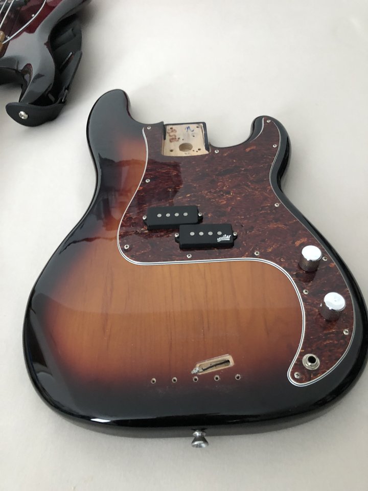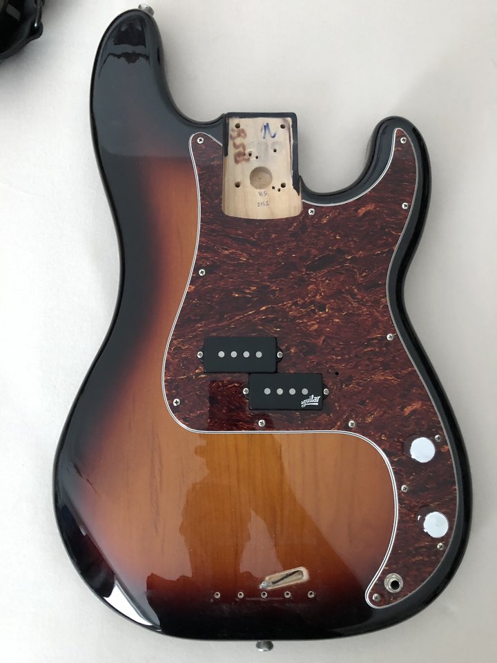 Verkaufe einen original Fender Body, geschirmtes Elektronikfach, CTS Potis und Aguilar P4-60 Pickup. Das Pickguard ist nicht original und es fehlt eine kleine Ecke der unteren Lage, sodass man das nur beim genauen Hinsehen sieht. Lt. Kofferwaage wiegt der Body loaded, wie er ist 2,4kg.
