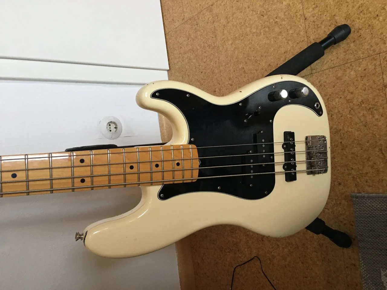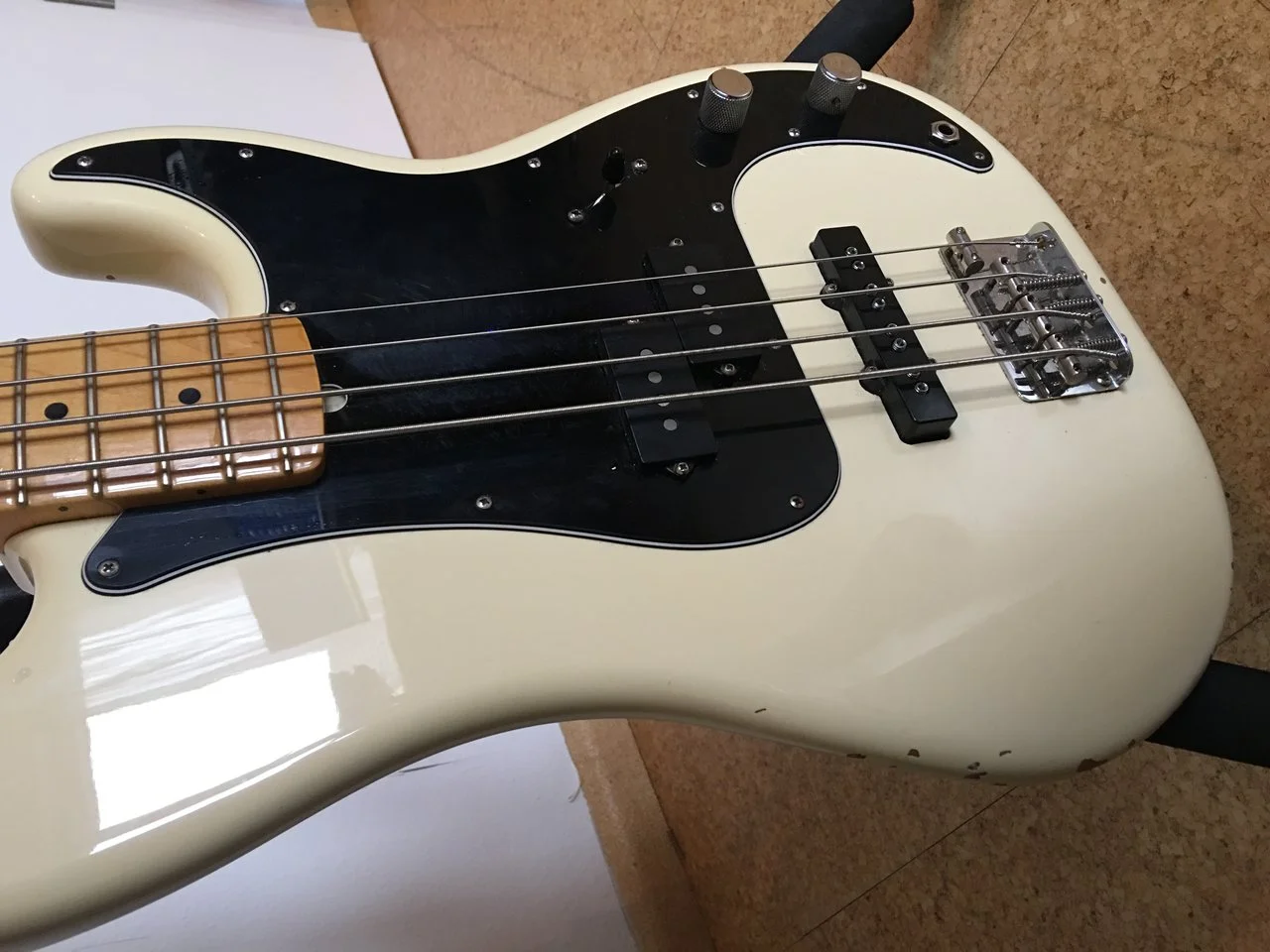 Er hat PJ Pickups Olympic White, Erlekorpus, Ahorngriffbrett,
