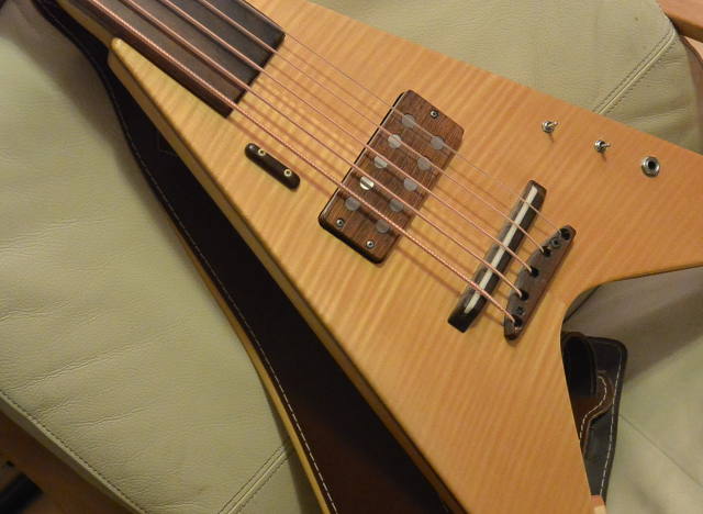 LaBella Copper White Tapes passen optisch leider nicht so recht auf meinen Bass, aber sie waren 5-saitig bei Big T vorrätig. Normale longscale-Saiten auf Medium Scale - durch den Korpus gefädelt passt das.