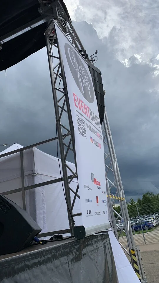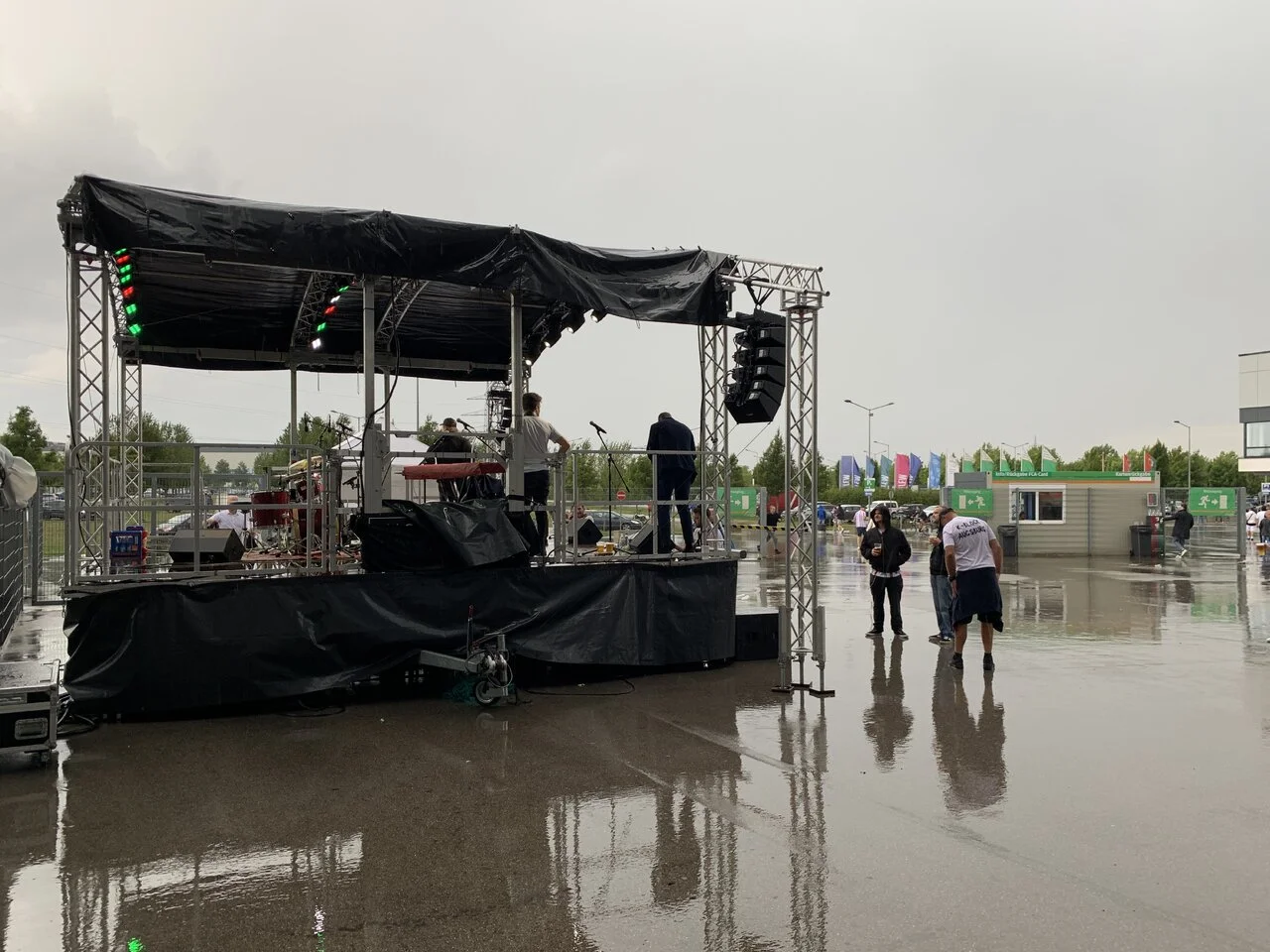 Es war ziemlich windig und der Techniker musste die Seitenplanen der (AnhĂ€nger-)BĂŒhne entfernen. Da gibt es wohl eine bestimmte WindstĂ€rke und dann löst der Windmesser einen Alarm aus. Der Wind und der Himmel sahen, trotz Sonne, nach Gewitter aus. Der Veranstalter hat nach RĂŒcksprache mit der Feuerwehr trotzdem grĂŒnes Licht gegeben, denn "das Unwetter wĂŒrde gerade so vorbeiziehen". Es kam dann wie es kommen musste, Platzregen, Unwetter etc.