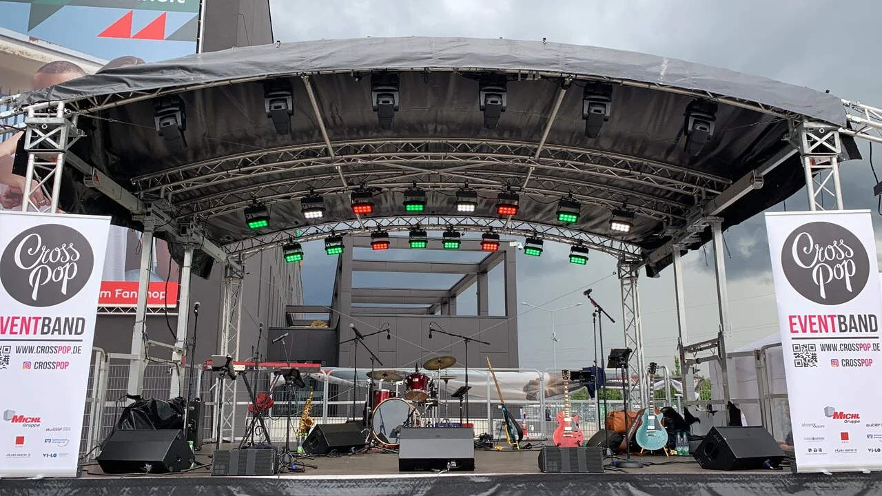 Der Regen kam seitlich durch die BĂŒhne und die FMC Box triefte vor Regen. Der Schlagzeuger und ich waren einmal komplett durchnĂ€sst. Nach fĂŒnf Minuten war der Spuk vorbei und wir konnten weiterspielen. Das Publikum war geblieben und hatte sich am Stadion untergestellt. Ich bin dann auf die BĂŒhnenmonitore umgestiegen (die waren wohl zumindest SpritzwassergeschĂŒtzt) und wir haben weitergemacht. Nach gut einer Stunde kam nochmal ein Unwetter, diesmal aus der anderen Richtung. Als es unseren Keyboarder dann einregnete und vor allem das Technikzelt mit Mischpult, Endstufe usw. gut 10cm unter Wasser stand, haben wir dann abgebrochen.