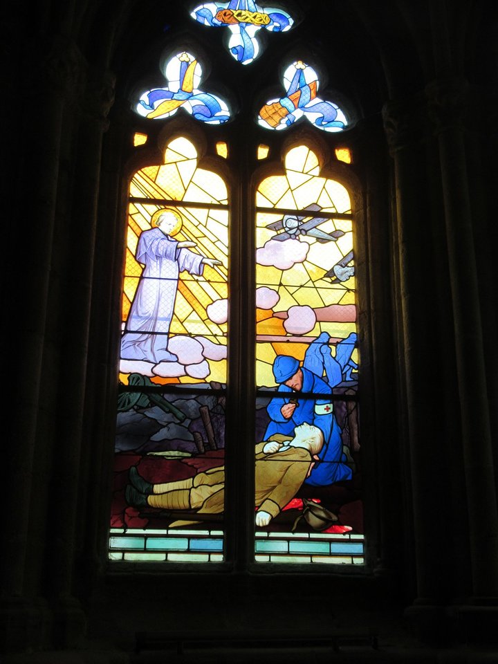 Jetzt wo ich die Bilder sehe, kann ich mich wieder dran erinnern. Ich hatte aber keine Fotos davon gemacht.Hier hab ich im Netz noch ein paar Bilder gefunden von diesen Fenstern mit untergehenden Kanonenbooten, Kapitalisten, Doppeldecker-Jagdflugzeugen und Feldsanitätern im Schützengraben:
