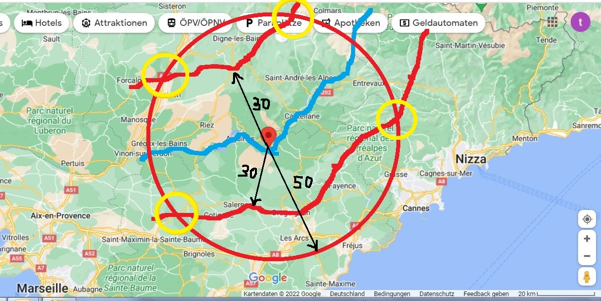 Aber rein theoretisch müßte der gesuchte Ort ungefähr in einem der 4 gelben Kreise liegen: