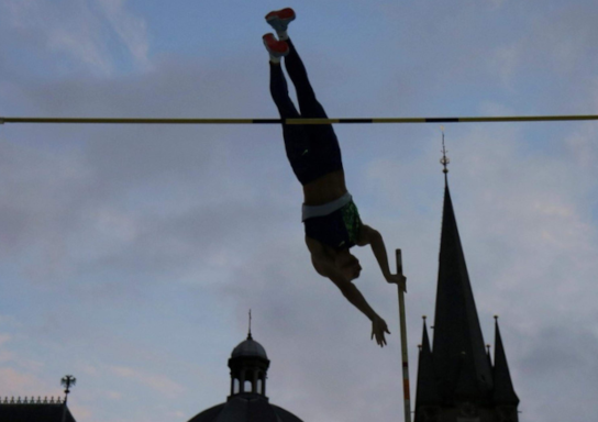 Stabhochsprungwettbewerbe in Innenstädten scheint es ja doch einige zu geben. Aber dieser ist auf dem Katschhof in Aachen, im Hintergrund der Dom.