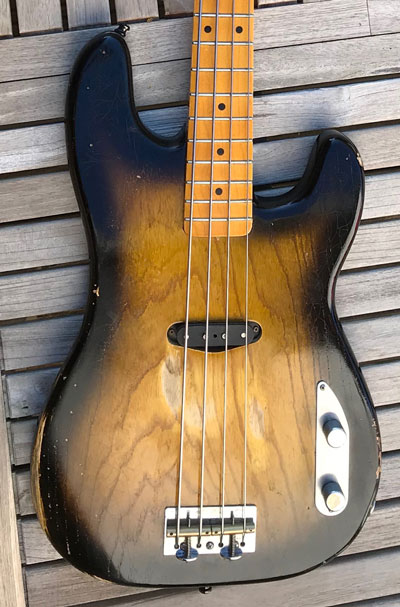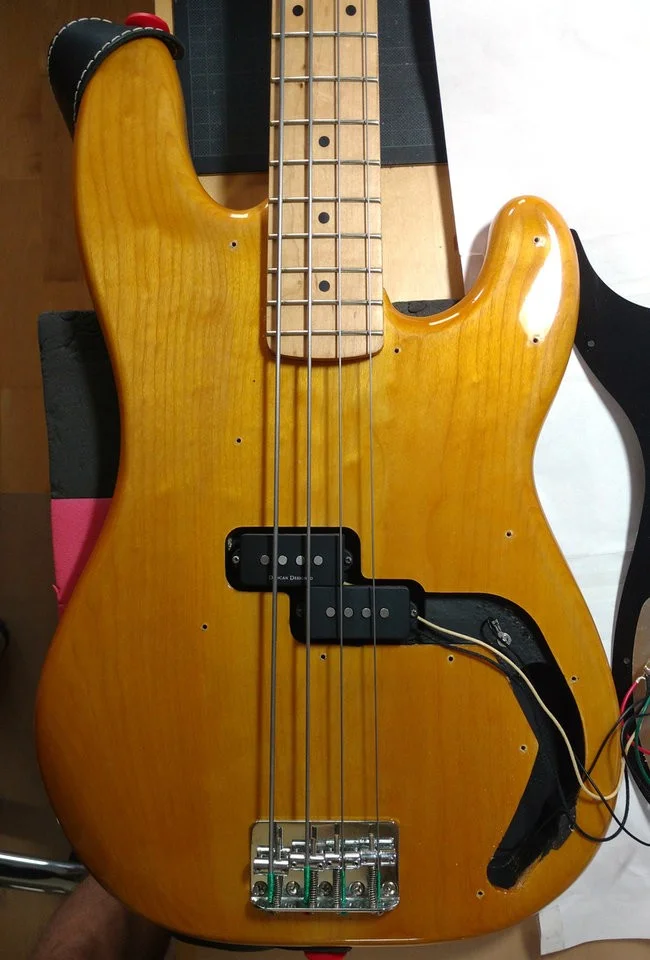 Mein Squier Preci hat einen zweiteiligen Korpus mit wunderbarer Maserung. Davon würde ich gerne mehr sehen, aber natürlich ist die Abschirmfolie und das Elektronikfach nicht sehr sexy anzuschauen