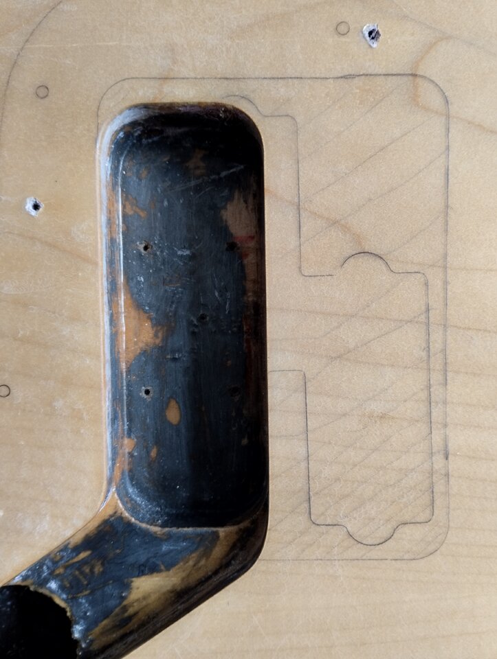 Na ja, wenn man fräst, sollte man erst mal alles abschrauben. Vielleicht ist ja jemand hier so nett und macht dir für kleines Geld eine Kopie einer StewMac Schablone.
