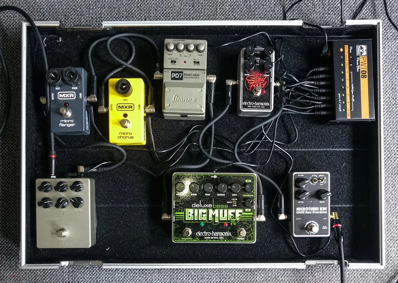 Hallo Freunde. Ich habe eine Frage technischer Natur. Mein Board ist aufgebaut und verkabelt wie auf dem Foto zu sehen (Monster Kabel für Bass zum Board zum Amp und dazwischen sehr teure Summer Kabel. Ebend ist das B3K an erster Stelle und das SuperSymmetrie an letzter Stelle. Es ist ein bisschen vom Bass beeinflusst (mit meinem Claas Custom sehr wenig, mit meinem Warwick Corvette wieder deutlich mehr), aber ich habe so doch ein wenig Nebengeräusche die schonmal nerven können in Spielpausen. Klar könnt ich jetzt einen Silencer zb den von EHX integrieren oder den BigMuffDeluxe so einstellen dass das als Gate geht, aber der Sound neutral bleibt (was mir dann aber den Muff als Option nimmt).
