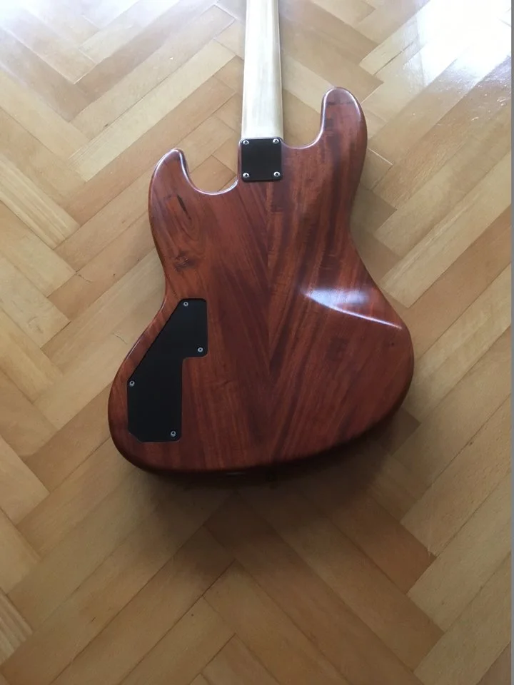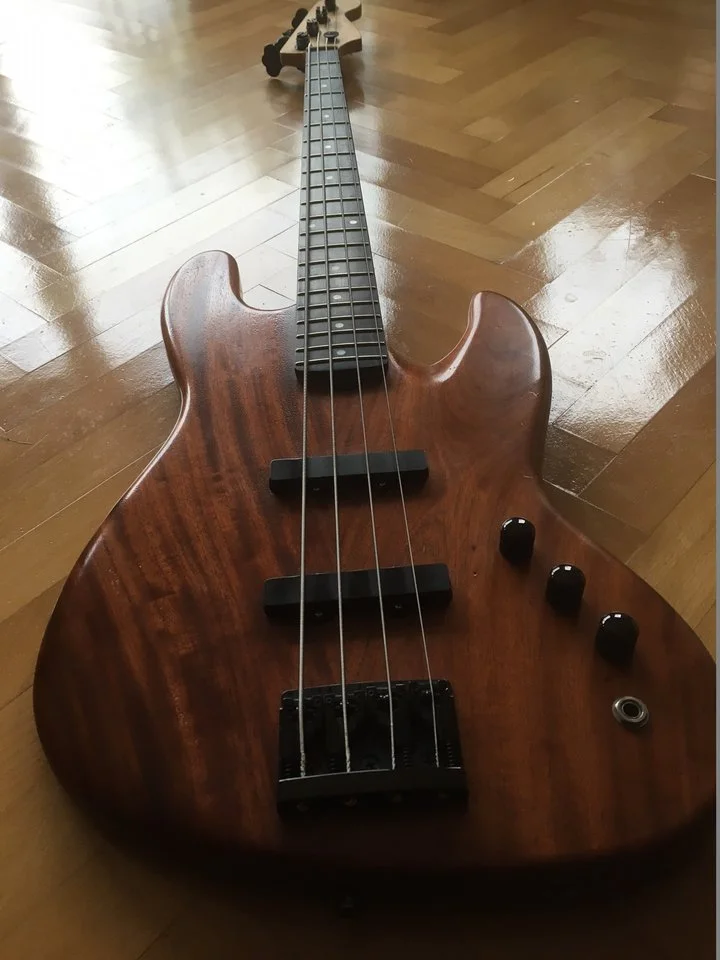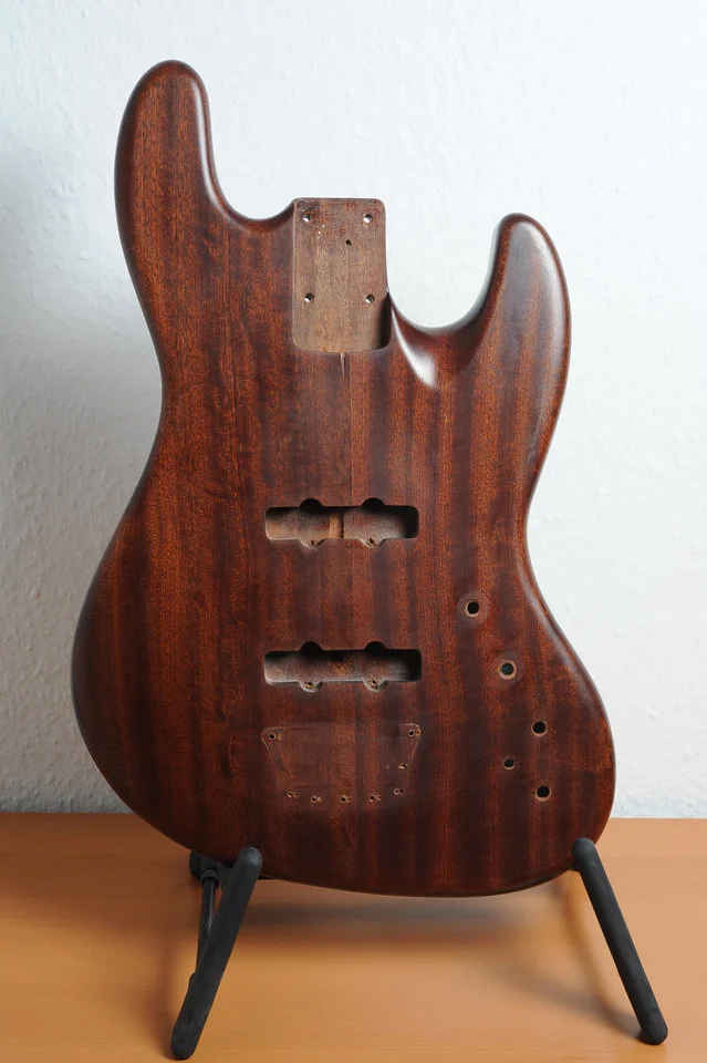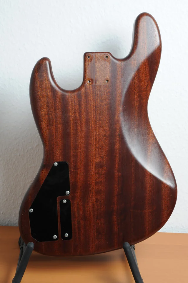 Der Body ist aus Honduras-Mahagoni, Ahorn Hals mit Ebenholzgriffbrett, Schaller-Mechaniken und aktive EMG-PU´s.