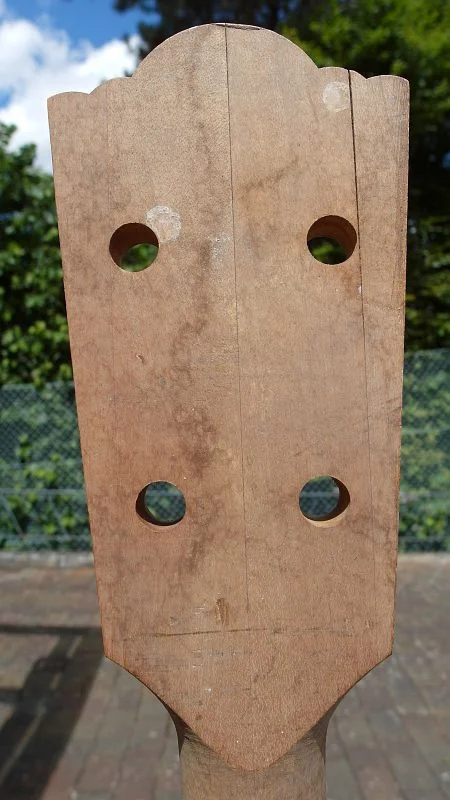 Würde auch die Saitenführung der E-Saite erklären.Der Korpus und Pickguard erinnern mich an Klira/Triumphator, auch diese Pickups wurden von Klira verwendet. Insofern sieht das sehr nach einem Frankenstein aus. Der Hals sieht nach einem verunfallten und 'selbst reparierten' Modell aus, auch bei Framus brachen bei unsachgemäßer Lagerung gerne mal die 'Ohren' der Kopfplatte weg. Wenn die eine Seite dann erstmal weg war und sich der neue Besitzer nicht an die Ersatzmodellierung getraut hat, bekam die Kopfplatte eben ein neues Design, ohne den linken Flügel...