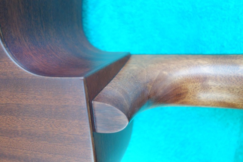 Der Hals ist für einen Aku mit 40mm Breite am Sattel eher schmal ausgefallen, mir rutscht deshalb gelegentlich beim Akkordspiel mit einem weniger schönen Ton die G-Saite vom Hals. Für mich persönlich hätte der Hals zunächst Aku-typisch 2 mm breiter sein dürfen, mittlerweile habe ich mich aber dran gewöhnt.