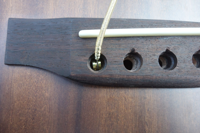 Etwas ungewöhnlich auch der geringe Duchmesser der Durchgangsbohrungen am Steg: Die Ballends der werkseigenen Saiten passen gut durch, die Ballends aller anderen Saitenhersteller aber nicht.