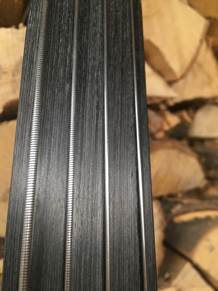 Im Lieferzustand war der Pickup bündig in das Pickguard eingedrückt. Der Hals hatte extrem Spiel und die Saiten liefen tangential an den Magneten vorbei. Zurückschicken? Er sah ja eigentlich gut aus. 4,3kg ist aber auch viel. Naja, erstmal anfangen. Pickup neu ausgerichtet - der hat erfreulich viel Output, so dass ein passiver Betrieb (mit der MM Shortscale-Schaltung) realistisch erscheint. Die Rounds gruben sich gleich ins Griffbrett. Mit Flats gab und gibt es einen massiven Toten Punkt auf C der G-Saite (der weggging, wenn 180g an der Kopfplatte hingen oder selbige gegen die Wand gedrückt wurde; Demontage der D-Saiten-Mechanik hat keine hörbare Veränderung gebracht). Mit Thomastik Infeld Flats geht es so einigermaßen. Das Griffbrett ist irgendein laminiertes, schwarz gebeiztes Holz mit relativ flachem Profil (12"?). Der Body besteht aus 3 Teilen, die aber auch nicht parallel gesägt sind, das Mittelstück war mal ein Trapez mit der kurzen Seite vorn. Optisch passt es. Vermutlich Linde.