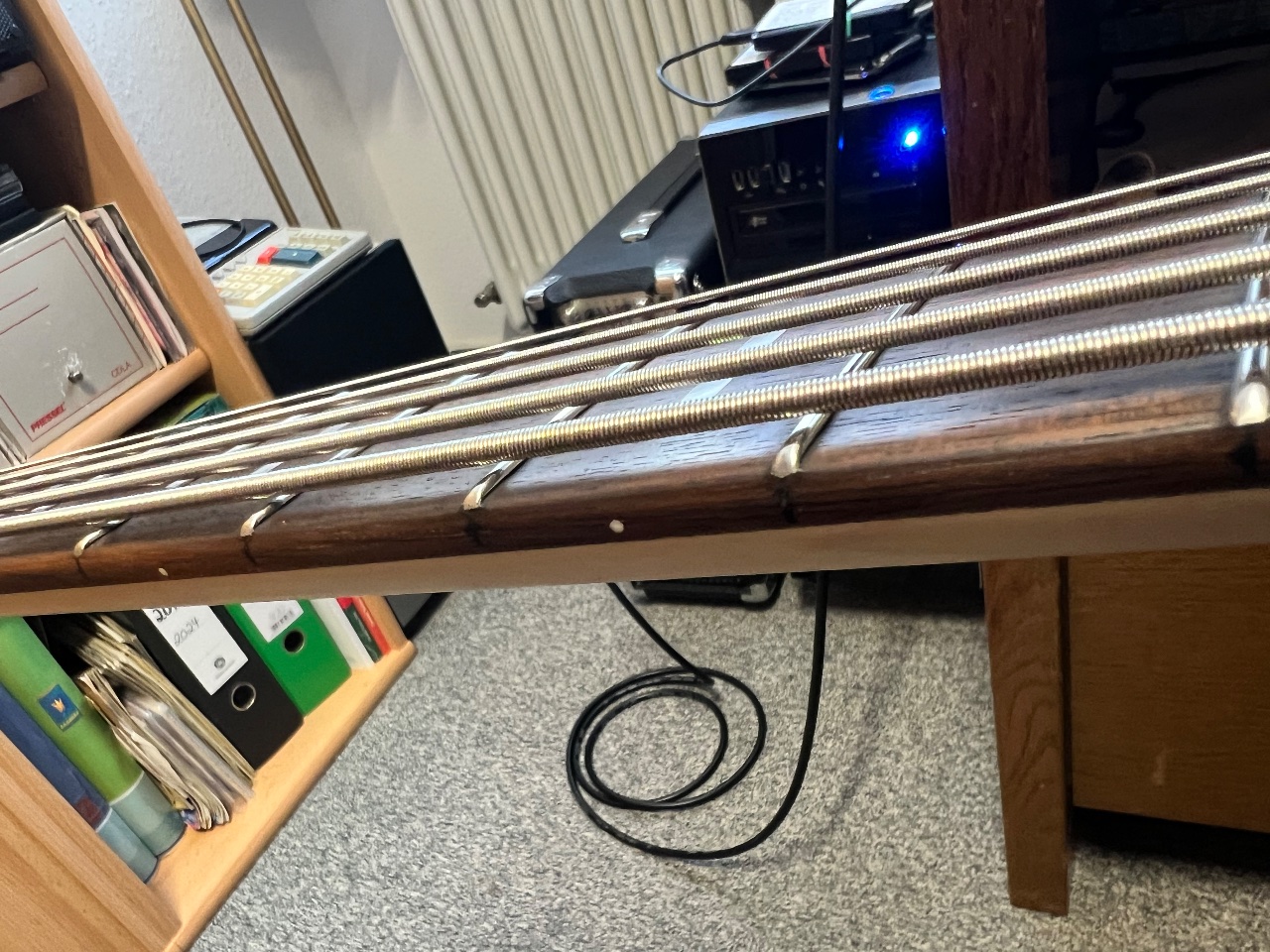 Das Instrument ist klasse verarbeitet. Schön gerade Hals mit niedriger Saitenlage einstellbar, schnarrfrei.