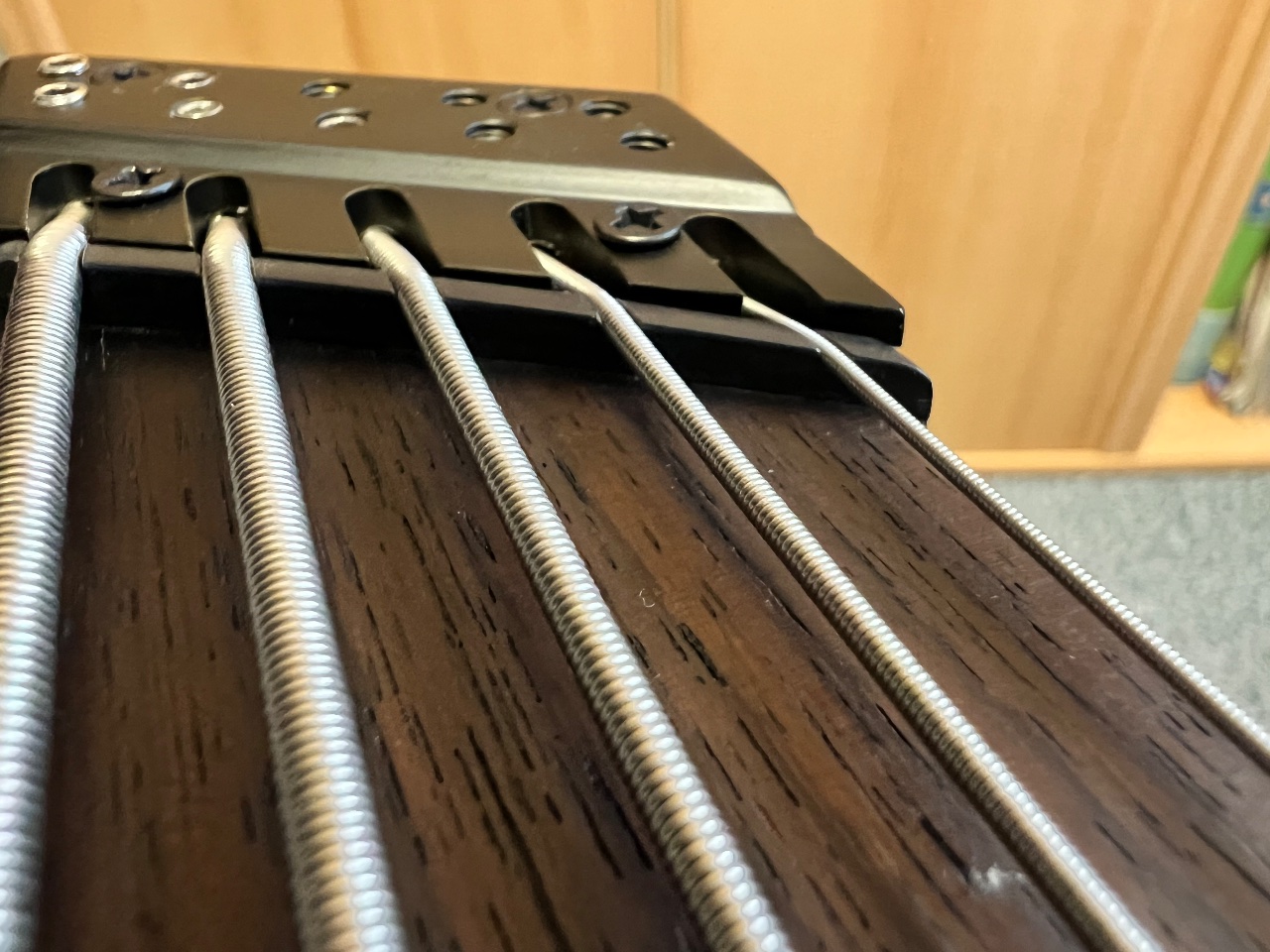 Der erste Bund ist eigentlich nicht bespielbar, da man sich hier wirklich Löcher in die Seite vom Zeigefinger rammt. Das Metall steht nochmals höher als der Sattel. Also das ist wirklich eine Fehlkonstruktion.