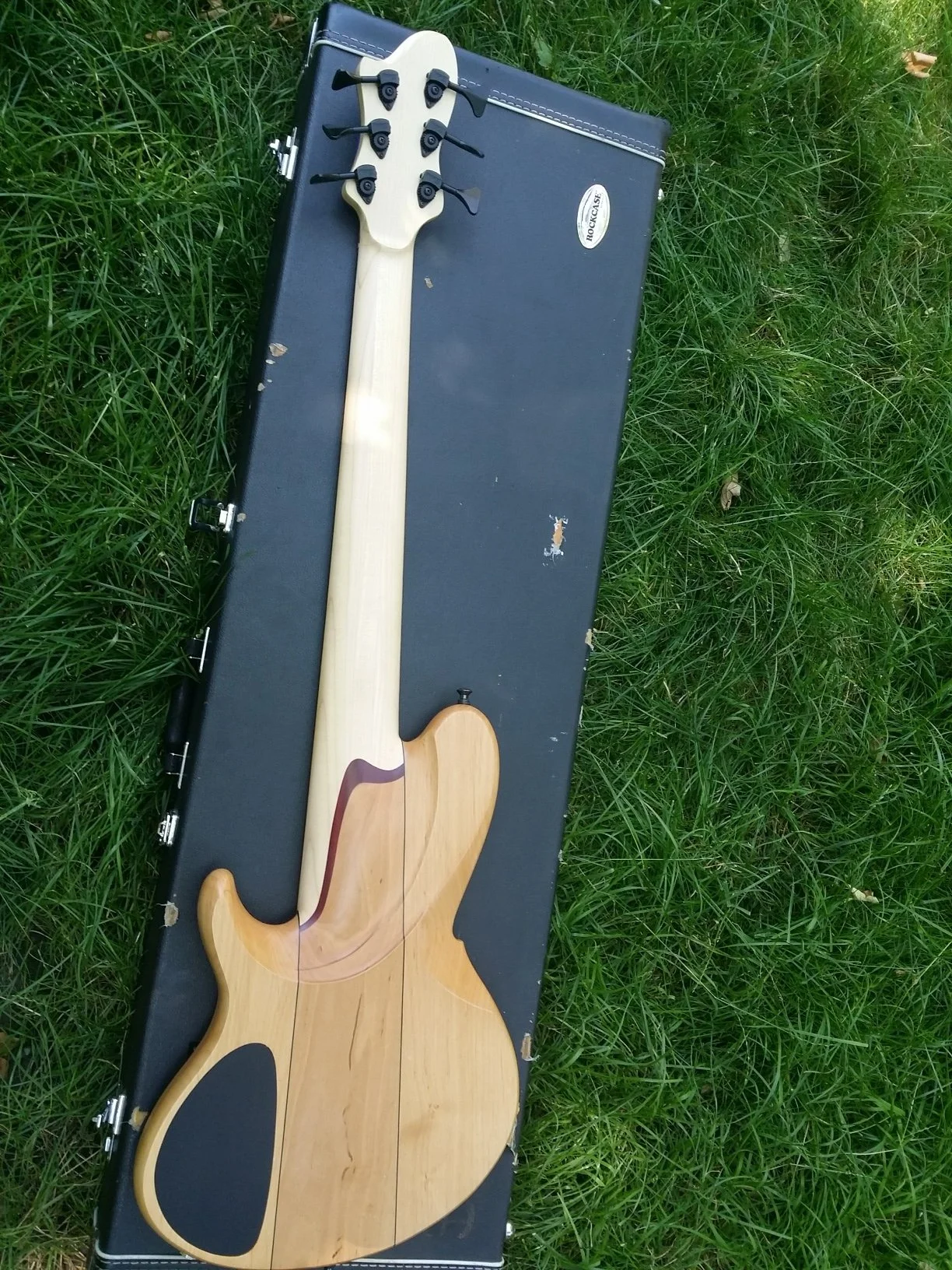 More specs: Bass culture foderaesque dual coils, John East preamp. alder body, chestnut top, maple neck, ebony fingerboard.