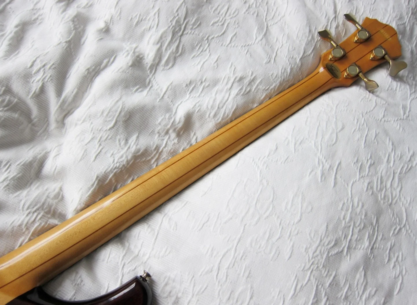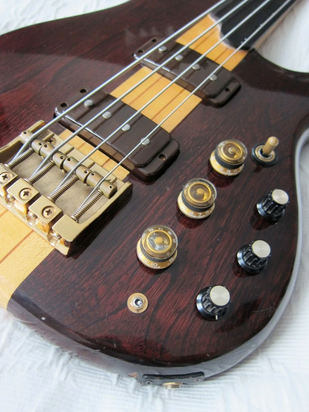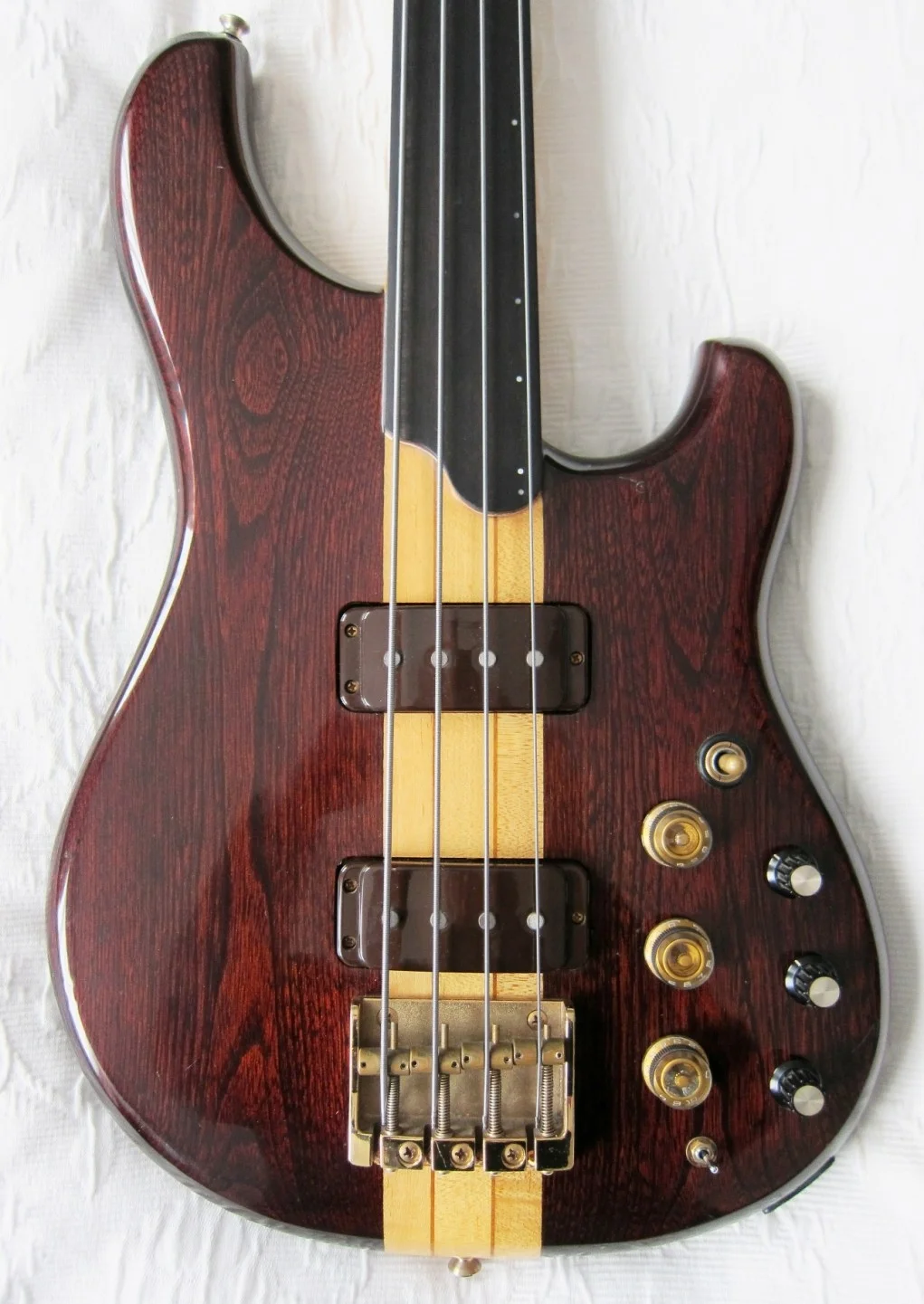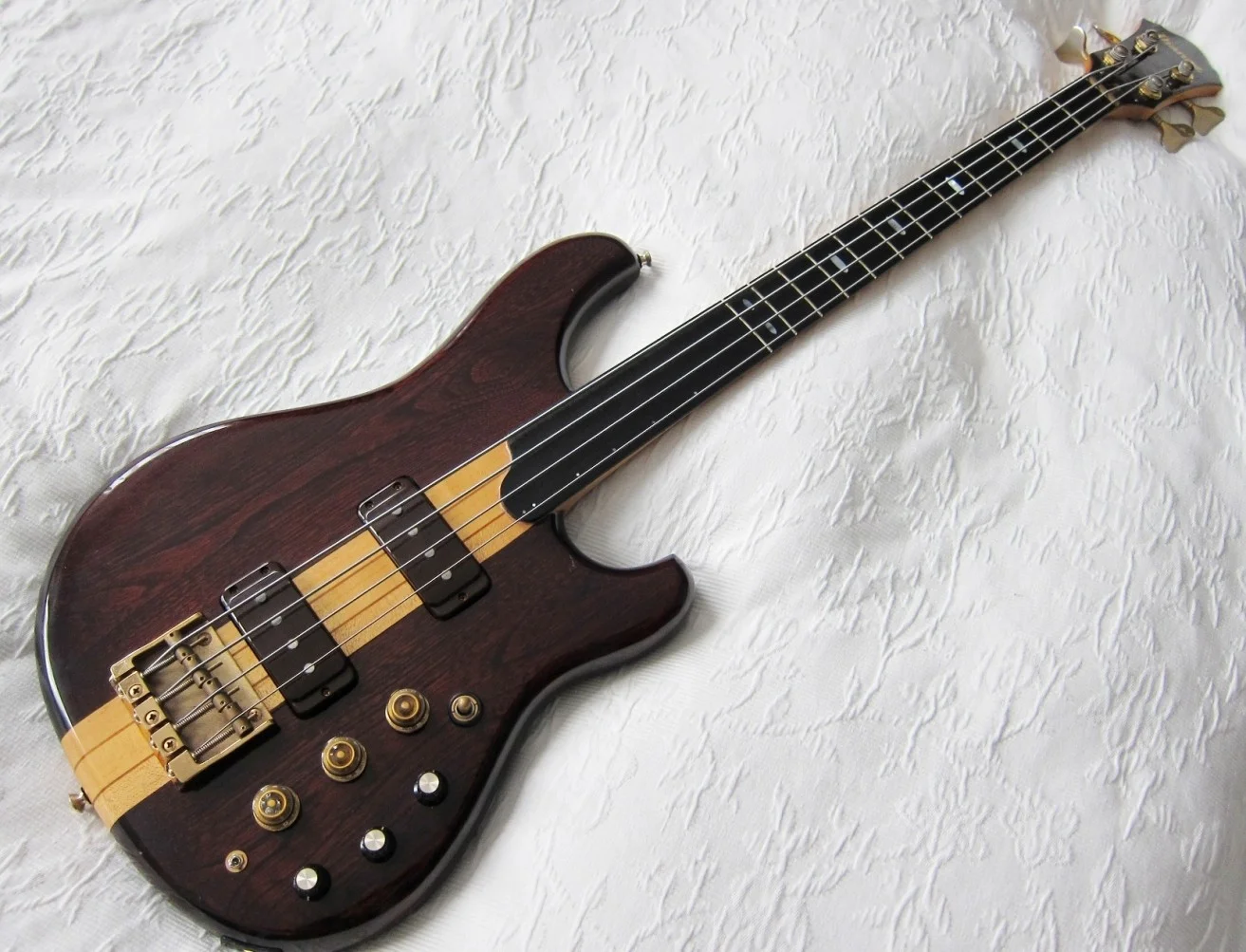 Not an everyday bass; half fretless and half fretted. The bass is basically a MC924 [but without frets from 12th position, and a "curl" ending the fretboard]; fantastic bass with very many tonal possibilities. It is a signature version of Alphonso Johnson [hence the initials AJ]. Active and passive, 3 Bands [active] tone, and also a separate passive tone control. Element switch. And a button to blend active and passive [as I interpret it]. The bass is still original [without modifications] and in good condition considering its age [1979]. Technically the bass is 100%, there is some signs of use, but nothing shocking; the pictures speak for themselves!