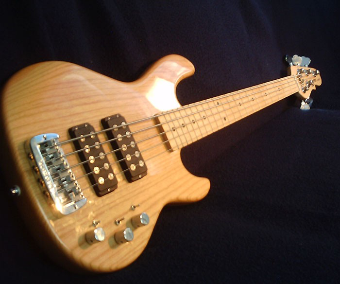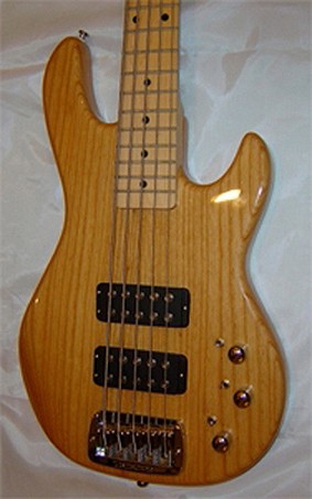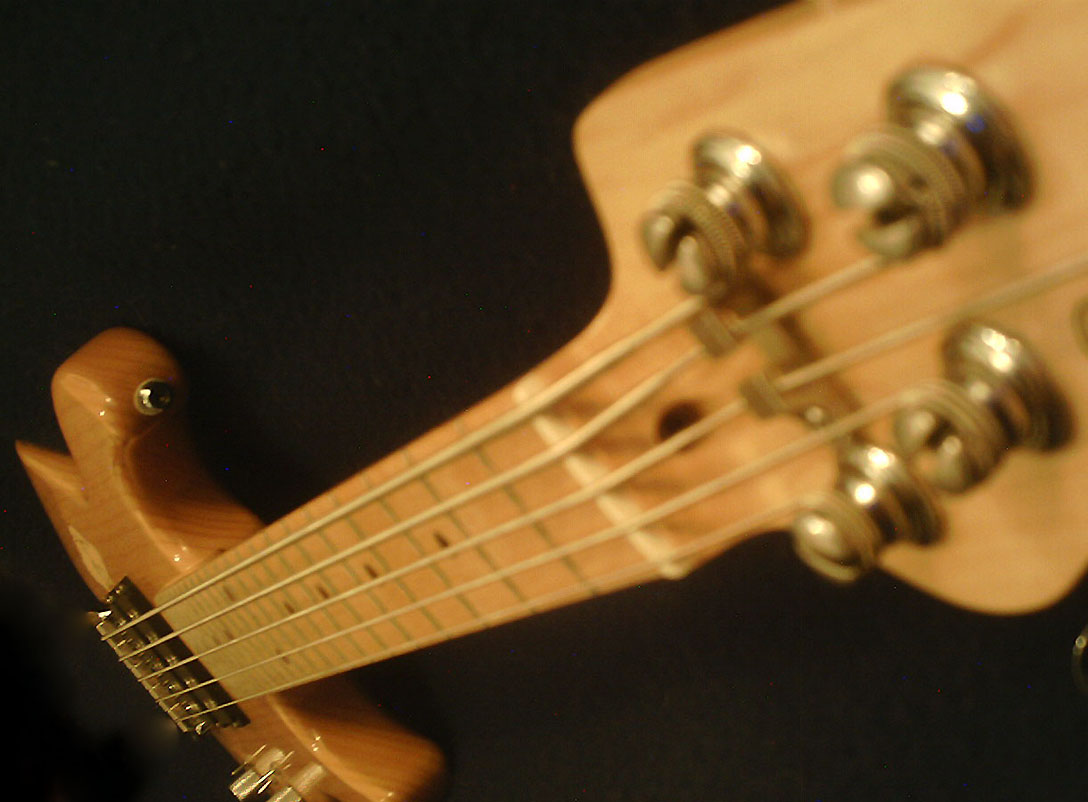 Wie man sieht, ist die Maserung des natural Ash-Bodies nahezu wie mit dem Lineal gezogen (das Biest wog knapp 6,4kg!!!) und in dieser Form sicher nicht häufig zu finden Ferner habe ich die ursprünglich oben abgerundeten Poti-Knöpfe durch glatte Fender-Modelle ersetzt, ebenso hat er anstatt des Stringtrees, der normalerweise montiert war den Saitenniederhalter der E/A-Saite eines Fender Roscoe Beck erhalten: