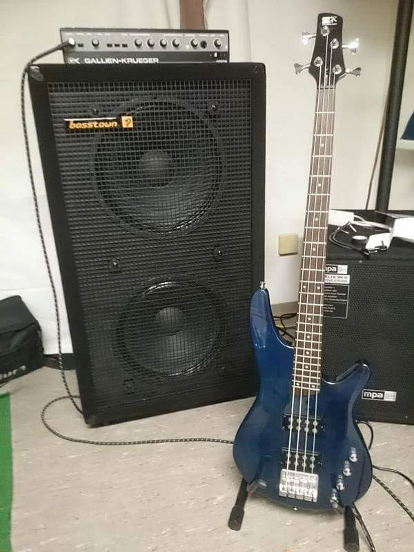 Großer Boxenturm und Mini-Amp sieht auf der Bühne recht kurios aus, musste mir auch schon lustige Sprüche diesbezüglich anhören: "Hey, ist das ein Autoradio da oben??!!".