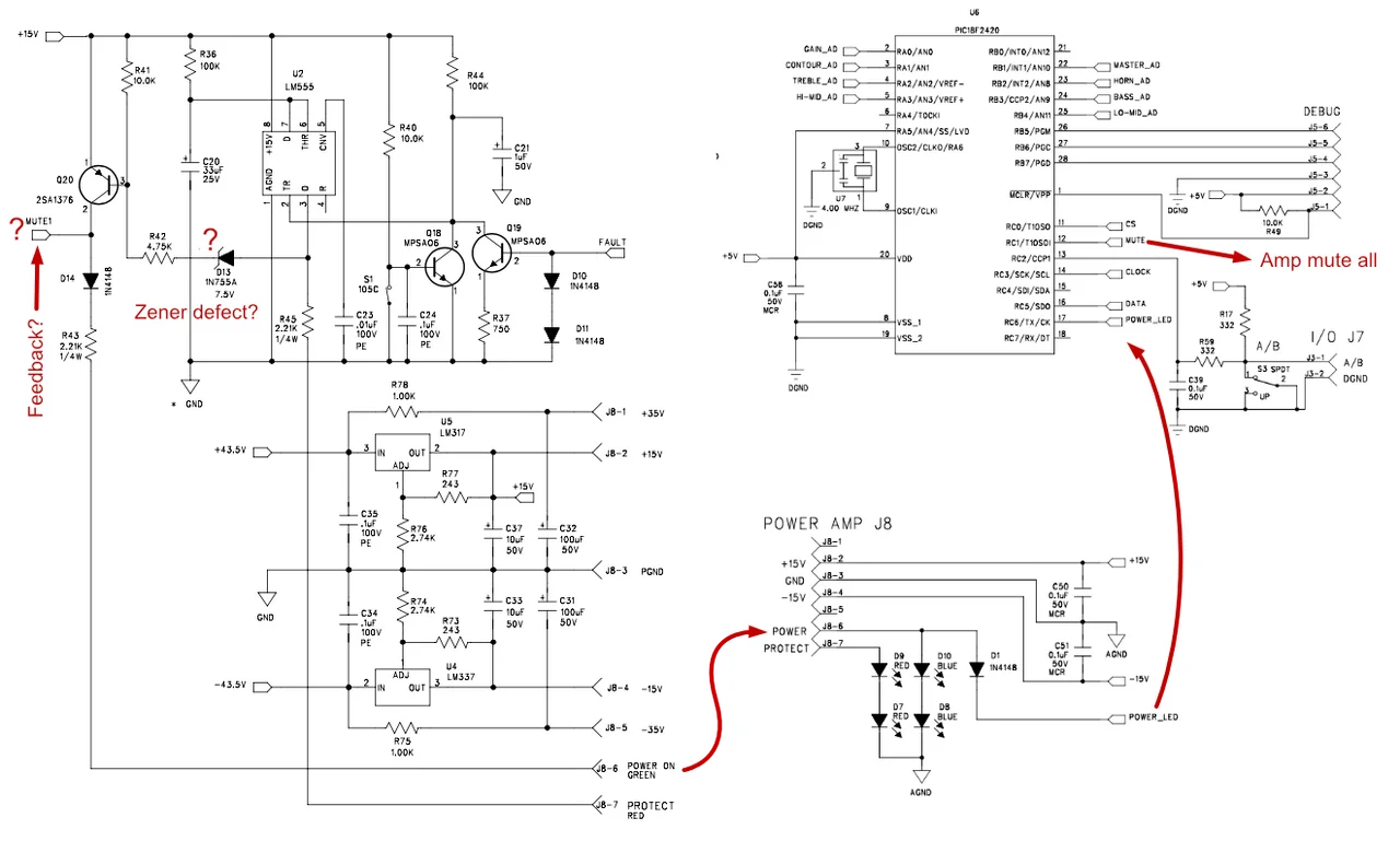 Ich habe die relevanten Teilschaltungen (ohne Mute Schaltung, hier nur "Amp mute all") mal aus den Seiten zusammenkopiert, rote Pfeile und Anmerkungen von mir. Damit sollte der Signalfluss recht einfach nachvollziehen zu sein.